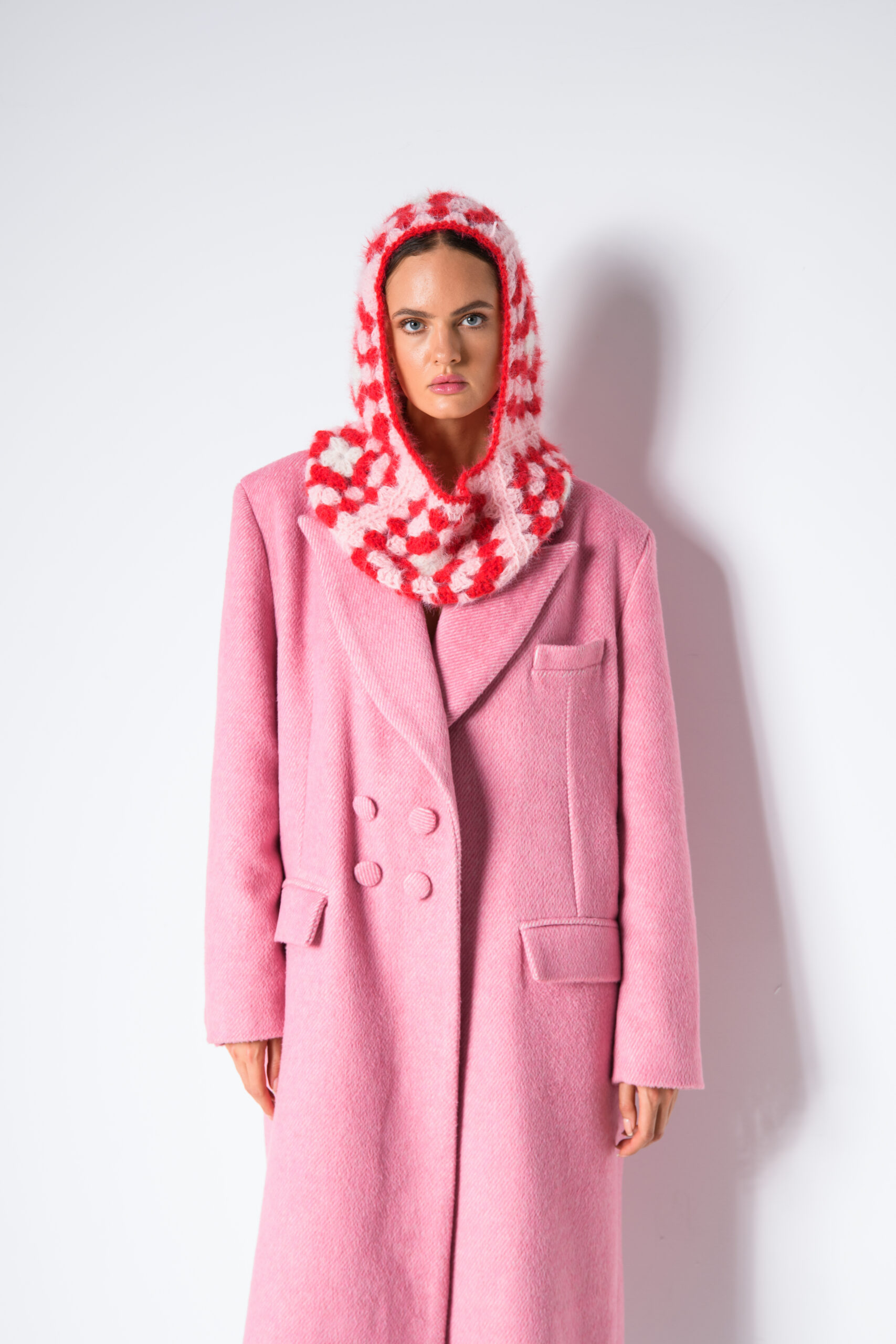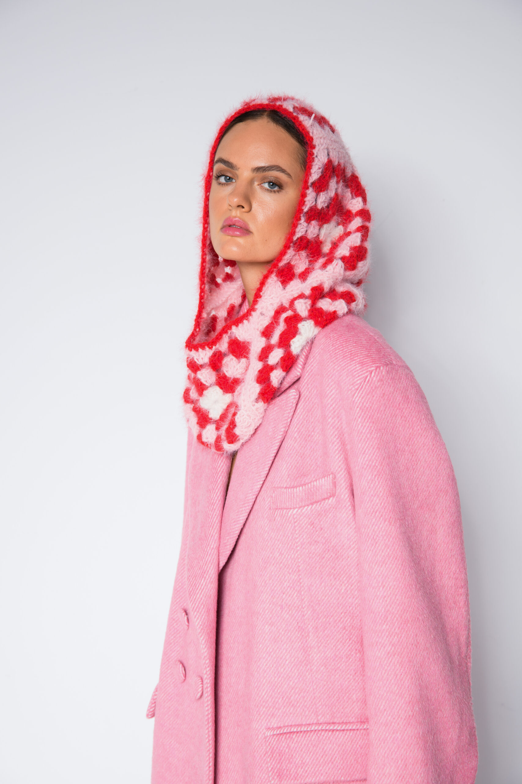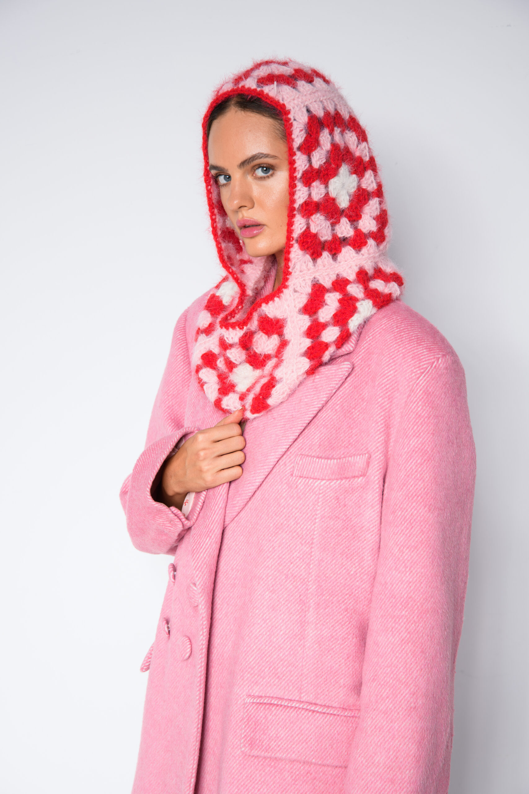 Balaklawa damska na jesień handmade, szydełkowana przez projektantkę Dorotę Cieszyńską. Wykonana z wełny, ciepła, lekka i przyjemna w dotyku. Ozdobiona czerwonym kwiatowym wzorem, pasuje zarówno do codziennych, jak i bardziej wyrazistych stylizacji.