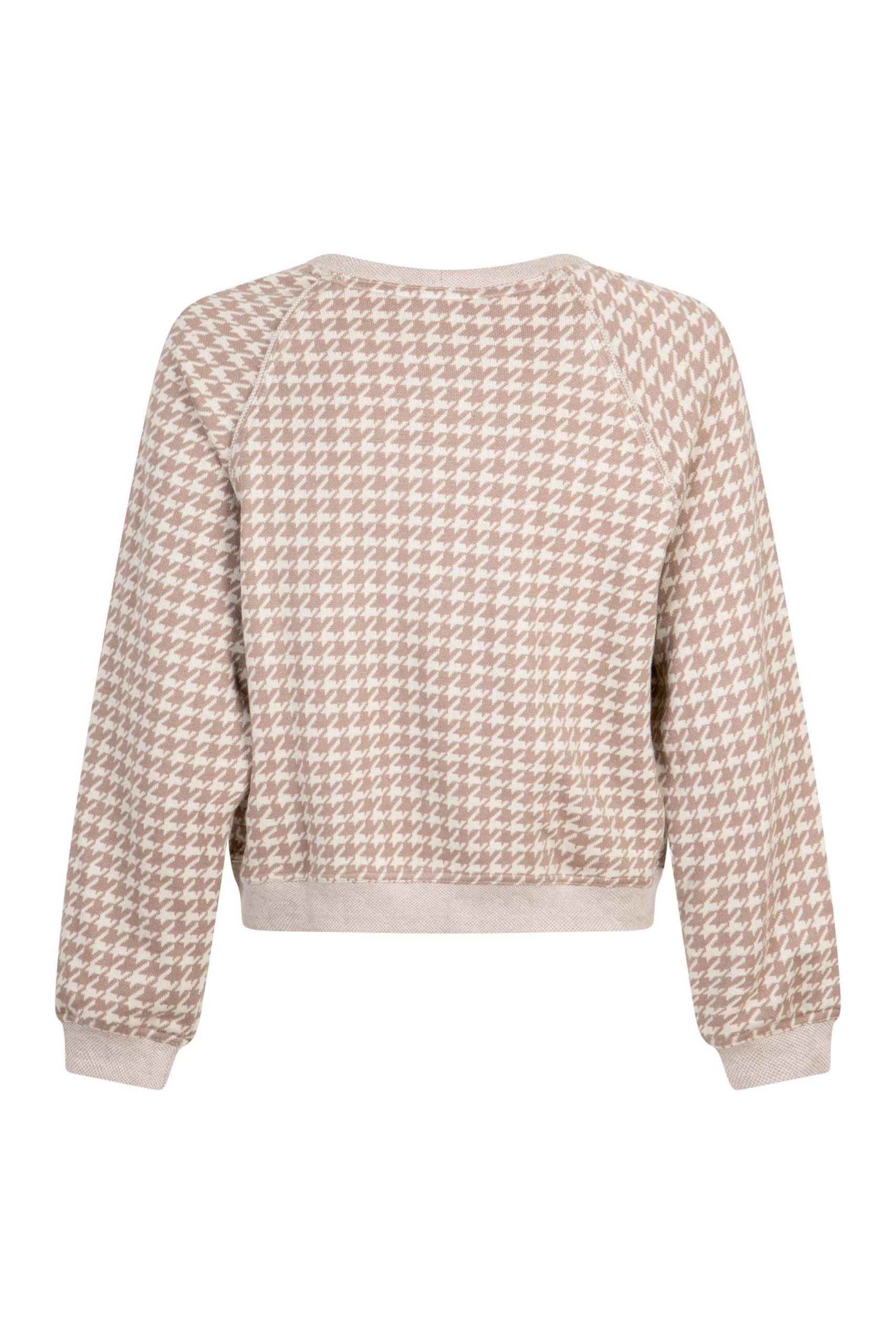 Luźna bluza w beżowych odcieniach z printem drobnej pepitki. Idealny element każdej jesiennej garderoby. Raglanowy rękaw i beżowe ściągacze. Jest ciepła i przyjemna w dotyku. Noś ją na różne sposoby, z jeansami Corrine i wygodnymi loafersami lub jako beżowy total look z szortami Clarissa i wysokimi kozakami.