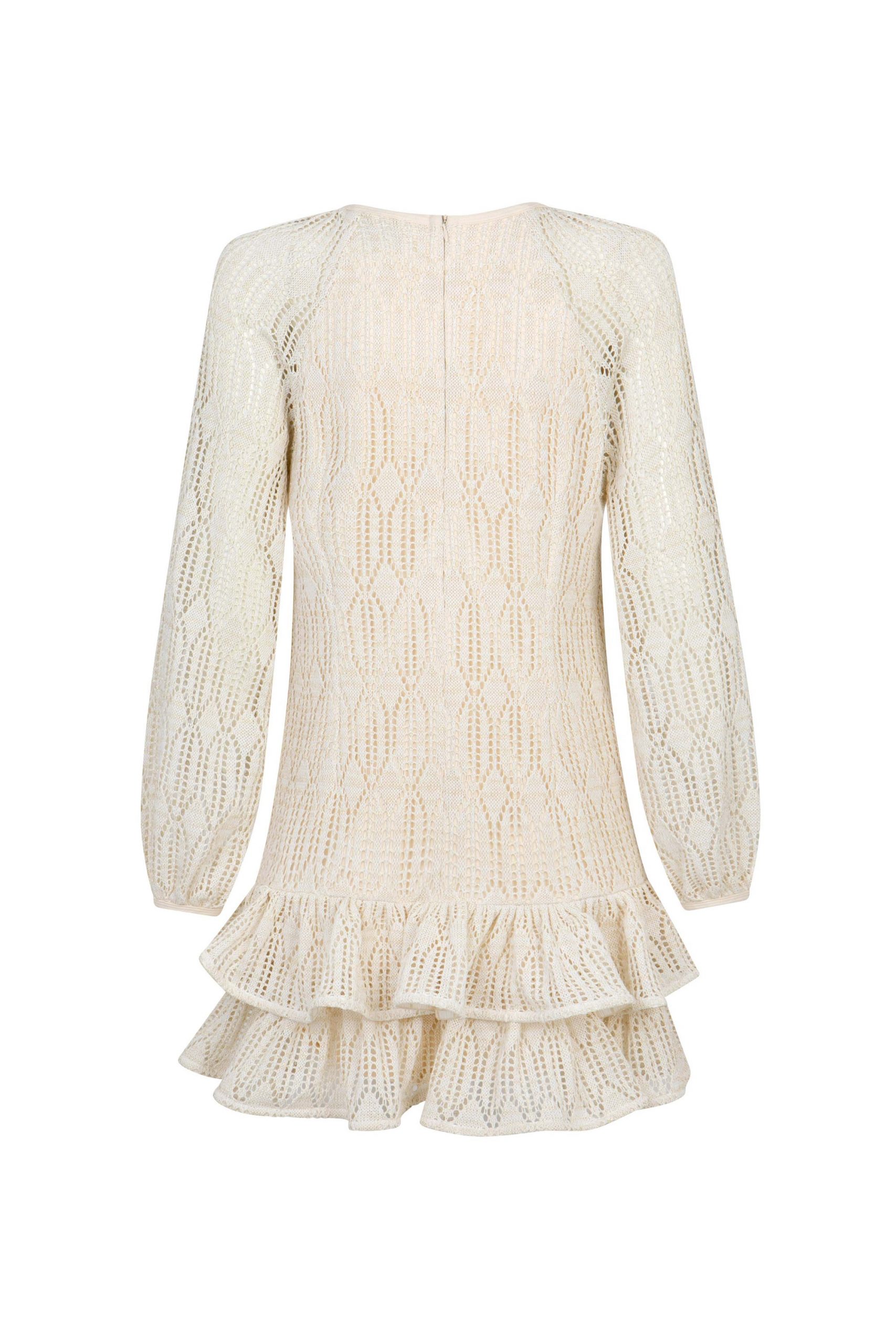 Połączenie beżowych koronek i falbanek. Bardzo kobieca wiosenna sukienka z długim rękawem. Obniżony stan, dwie falbanki wykończone logowaną lamówką  i prześwitujące lekko bufiaste rękawy. Podkreśl talię paskiem dodaj ulubione dodatki i noś ją na co dzień lub na wyjątkowe okazje.