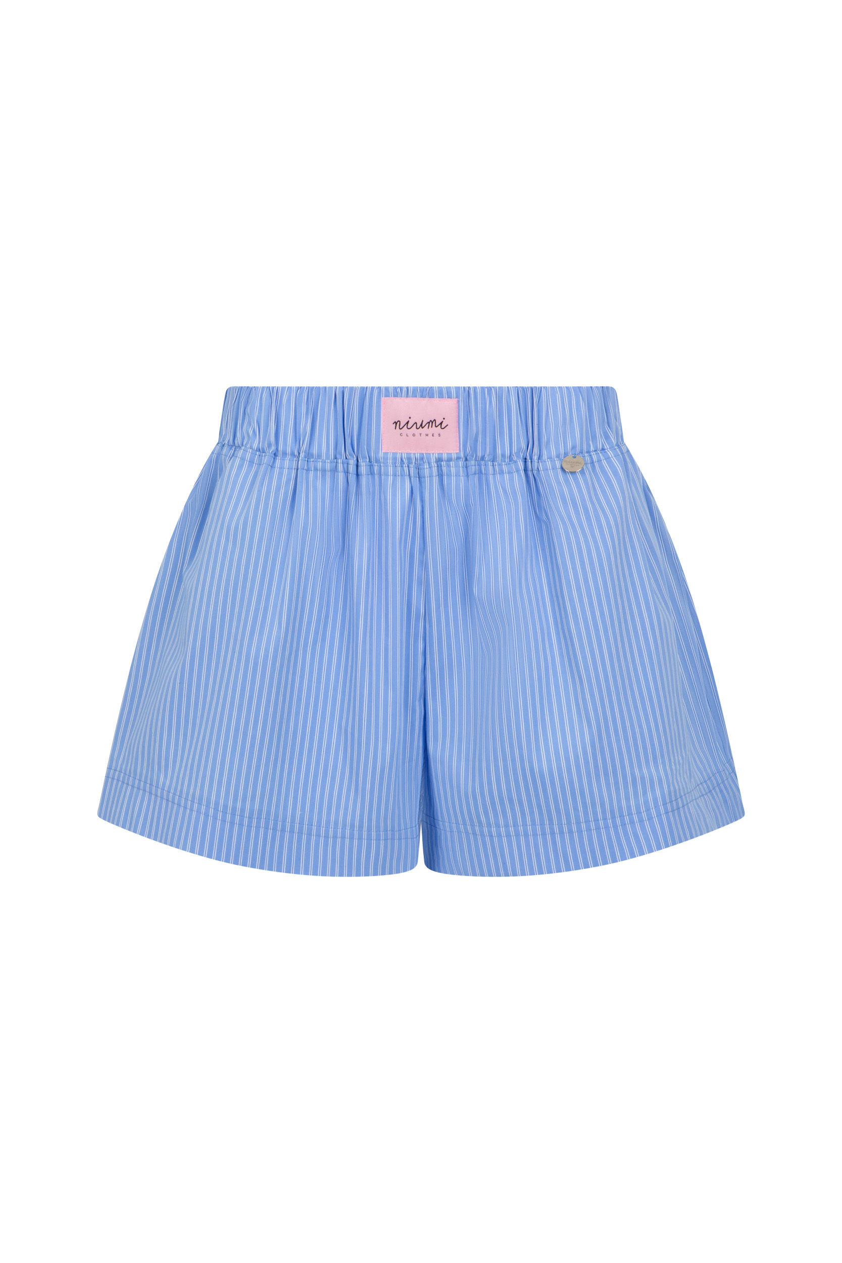 Błękitne szorty damskie w paski to lekka i wygodna propozycja na lato, uszyta z tej samej przewiewnej tkaniny co koszula i top z kolekcji. Luźny fason i elastyczna talia zapewniają swobodę ruchów, a miękki materiał z wysoką zawartością bawełny sprawia, że szorty świetnie sprawdzą się nawet w najcieplejsze dni. Na środku znajduje się różowa metka Niumi, która dodaje całości delikatnego, ale wyrazistego akcentu. W komplecie z pozostałymi elementami tworzą spójną, letnią stylizację.