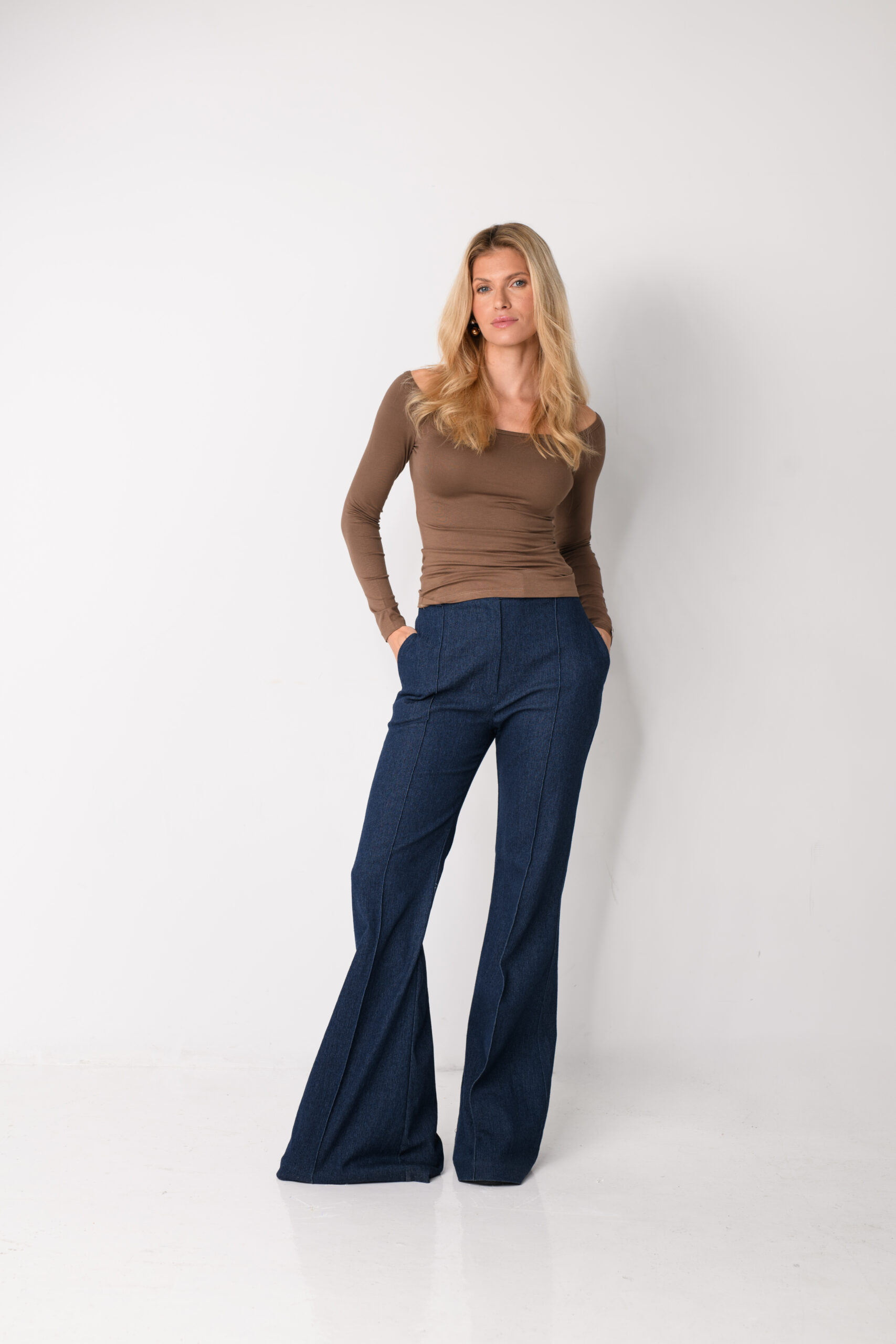 Brązowa bluzka hiszpanka damska z długim rękawem. Dekolt odsłaniający ramiona i elastyczna gumka podkreślają talię. Wiskozowa, elastyczna tkanina dobrze dopasowuje się do sylwetki i jest przyjemna w noszeniu. Stonowany kolor i prosty krój sprawdzą się w wielu jesiennych stylizacjach.