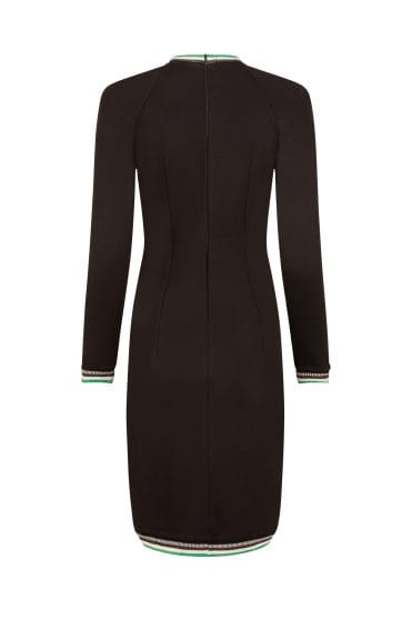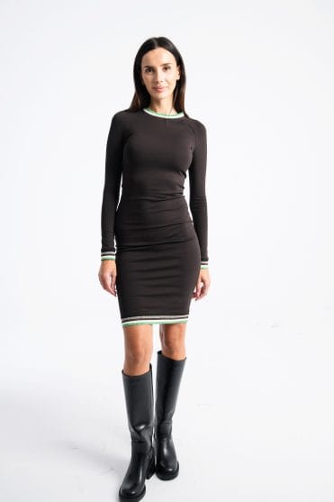Brązowa sukienka na jesień w głębokim czekoladowym odcieniu. Minimalistyczny fason pięknie podkreśla sylwetkę. Kolorowe ściągacze przy szyi, rękawach i u dołu nadają lekko sportowy styl. Długość mini sprawdzi się zarówno na wieczór, jak i do casualowych stylizacji.