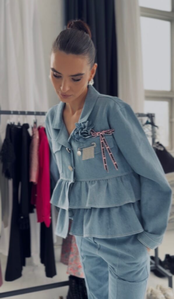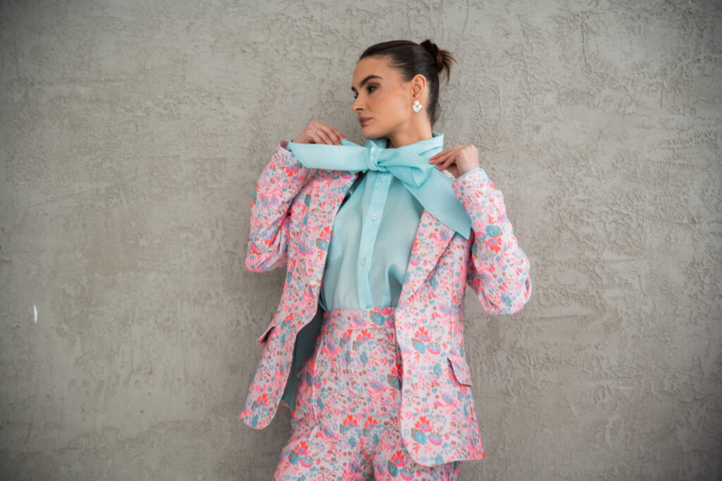 W tym sezonie obok różowego, żakardowego zestawu bomberka + mini spódnica, pojawia się również garnitur w kwiaty — kobiecy, wyrazisty, a jednocześnie bardzo nowoczesny. Taki komplet damski na wiosnę świetnie wygląda zarówno w całości, jak i w rozdzieleniu: marynarka damska w kwiaty do klasycznych jeansów lub czarnych spodni, a spodnie do gładkiej koszuli damskiej świetnej jakości.