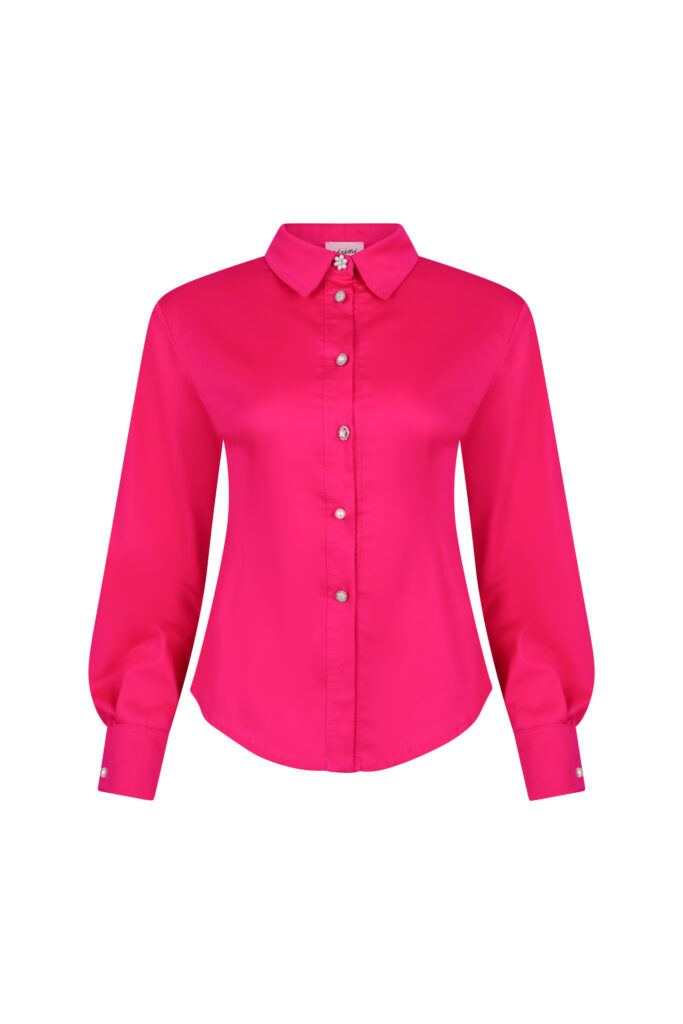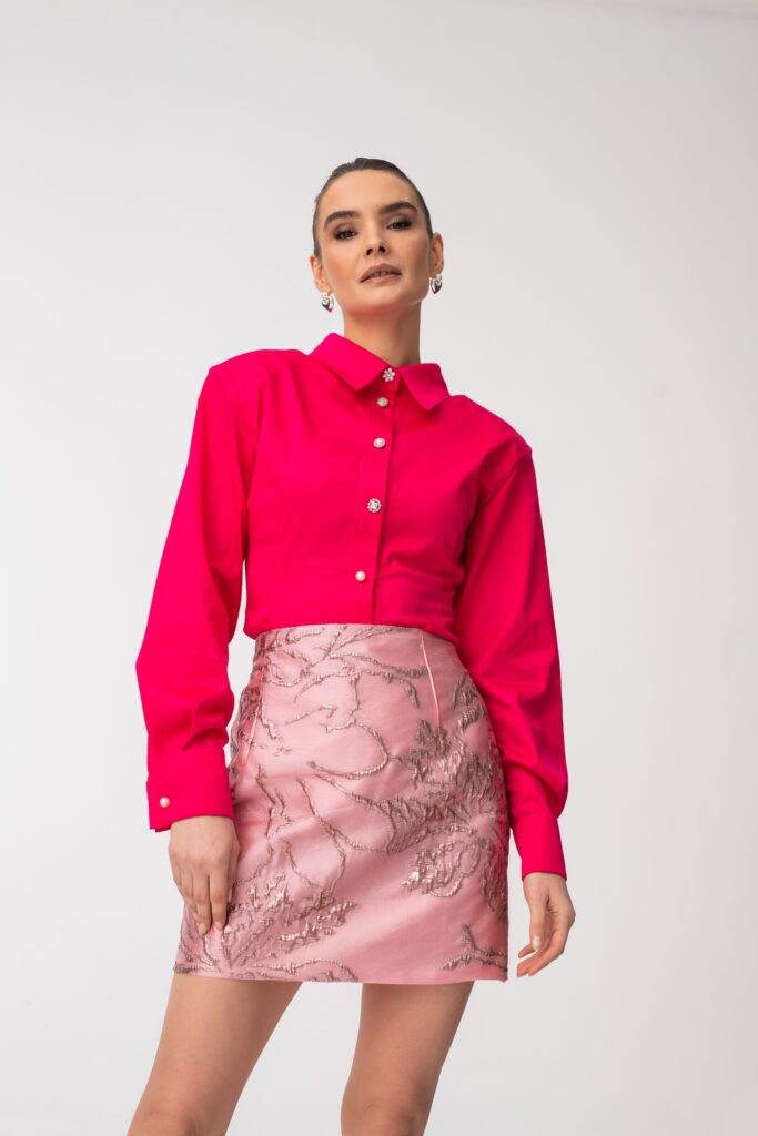Róż to nie tylko komplety, ale także koszule na wiosnę, które w sezonie 2026 grają pierwsze skrzypce. W kolekcji pojawiła się różowa koszula z żabotem, ozdobnymi mankietami oraz guzikami przypominającymi biżuteryjne spinki — to koszula damska świetnej jakości, która łączy klasykę z nowoczesnym detalem. Idealnie komponuje się z żakardową spódnicą mini, ale równie dobrze wygląda noszona solo do prostych spodni czy jeansów. Kolejnym mocnym akcentem jest taliowana fuksjowa koszula z dekoracyjnymi guzikami, zaprojektowana tak, by pięknie podkreślać sylwetkę. To koszula damska świetnej jakości, która wyróżnia się krojem, starannie dobranym materiałem i precyzją szycia w Polsce. Świetnie sprawdzi się zarówno w zestawieniu z czarnymi spodniami, białymi spodniami, jak i denimem — dokładnie tak, jak oczekują tego klientki marek premium.
