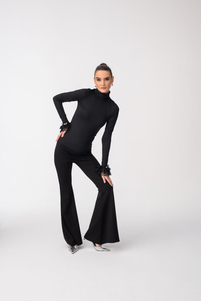Wiosna 2026 pokazuje wyraźnie, że klasyka nie wychodzi z mody — zmieniają się jedynie detale. Jako polska marka modowa premium, szyjąca w Polsce, stawiamy na ponadczasowe formy z charakterem. Przykładem jest czarny golf z ozdobnymi, koronkowymi wstawkami na rękawach. To projekt, który pod marynarką damską wygląda elegancko i minimalistycznie, ale dzięki detalom zyskuje wyrazistość. Świetnie sprawdzi się również w połączeniu z żakardową spódnicą czy czarnymi spodniami dzwony — tworząc klasyczną, ale dopracowaną stylizację.