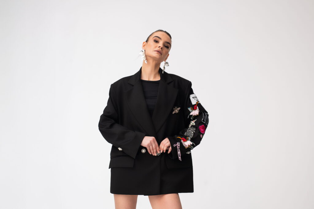 Jednym z najsilniejszych trendów na wiosnę 2026 są naszywki i broszki, czyli detale, które nadają ubraniom charakter i indywidualność. Nasze klientki od dawna pokochały marynarki damskie z naszywkami, dlatego jako polska marka modowa premium regularnie tworzymy limitowane edycje tych projektów. W sezonie wiosennym postawiłyśmy na czarną marynarkę damską z wiosennymi naszywkami na rękawie — wyrazistą, ale nadal elegancką i uniwersalną.