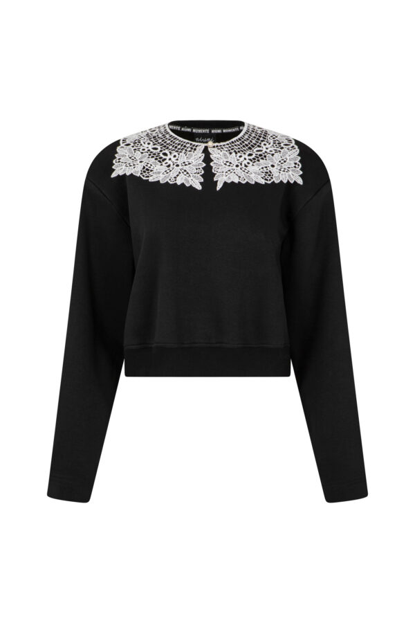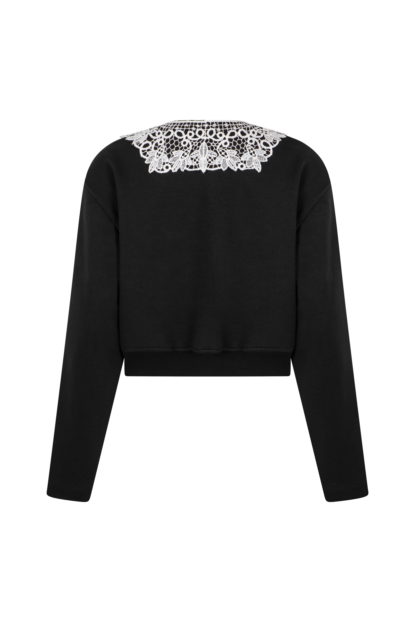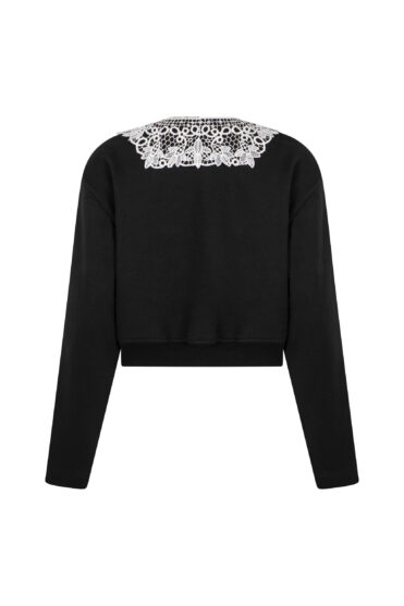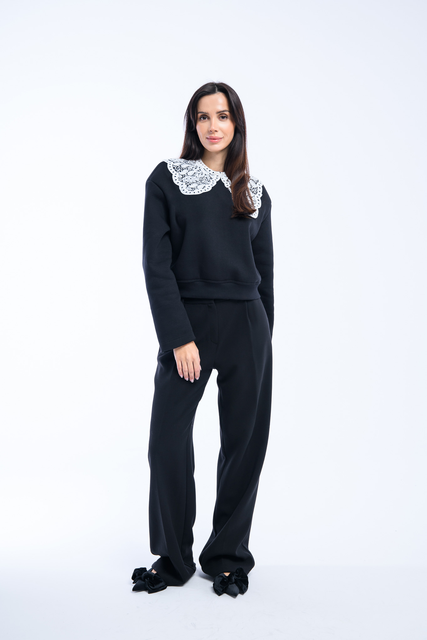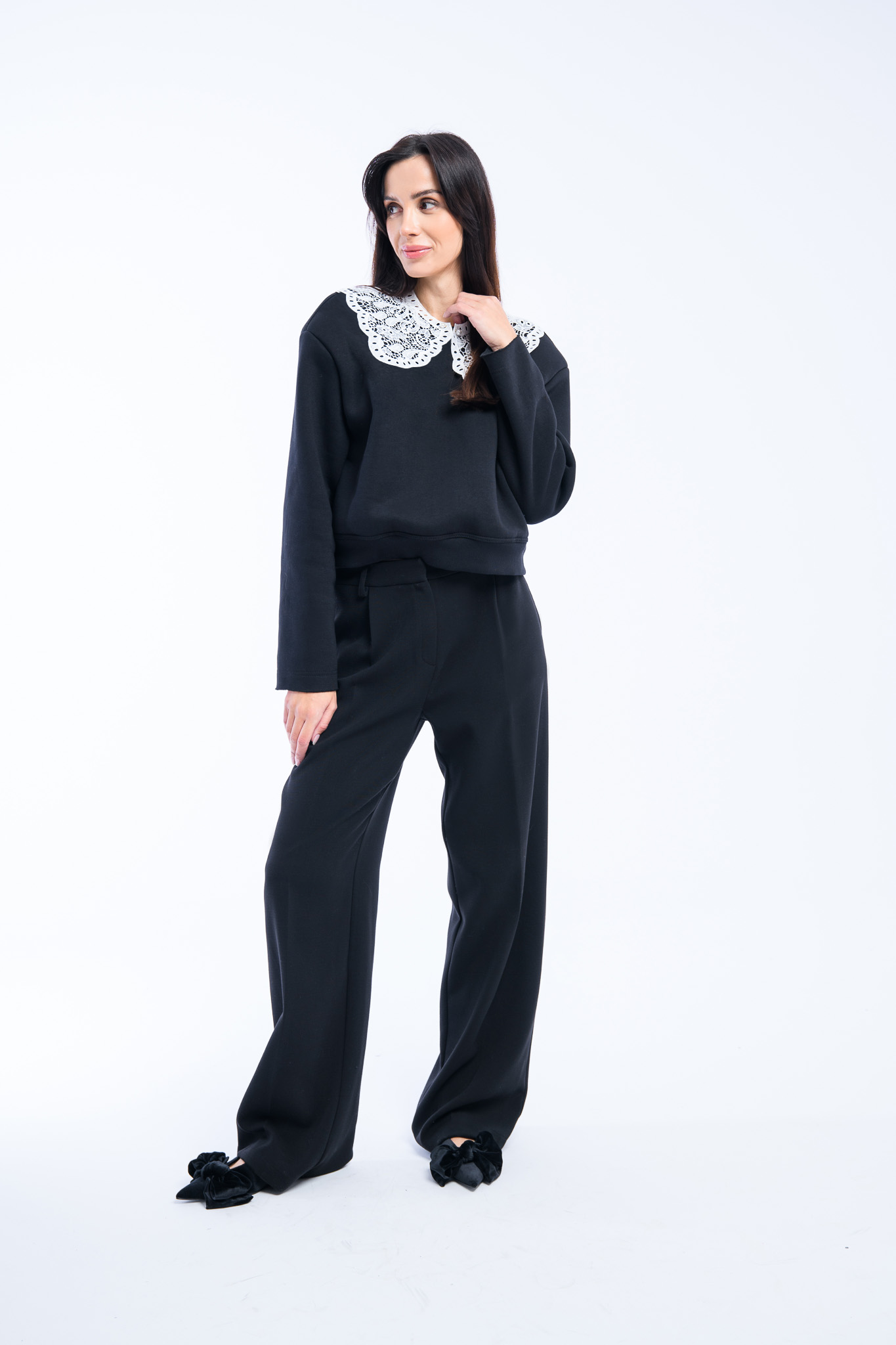 Czarna bluza damska z kołnierzem to propozycja dla kobiet, które chcą połączyć wygodę z elegancją. Model wyróżnia się białym kołnierzem zapinanym na perłowy guzik – ten detal sprawia, że świetnie wpisuje się w eleganckie stylizacje na co dzień. Krótszy krój doskonale współgra ze spodniami z wysokim stanem czy spódnicami, a szerokie rękawy i poduszki na ramionach dodają sylwetce nowoczesnego kształtu.