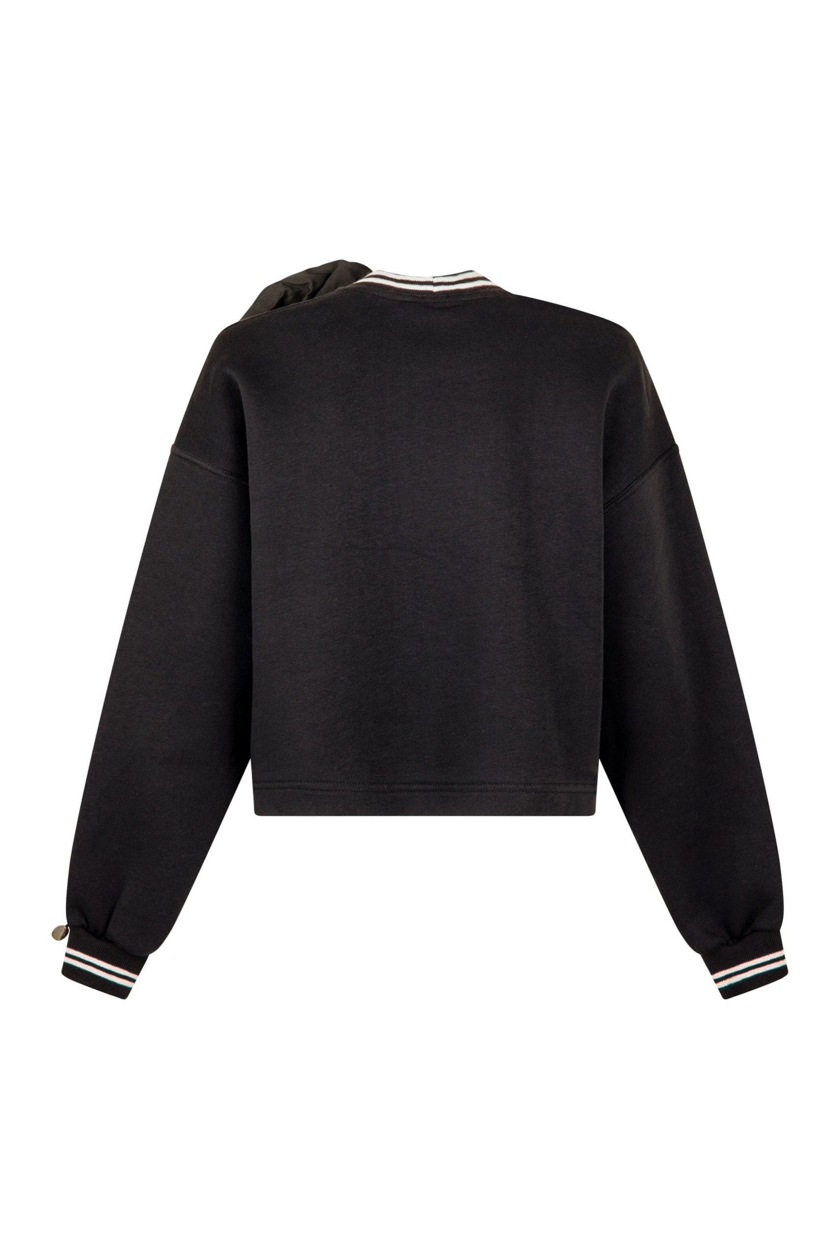 Czarna bluza z aplikacjami. Świetnej jakości czarna bluza damska ma przy szyi oraz na rękawach biało-czarne ściągacze. Czarna bluza będzie świetnym dodatkiem do każdej sportowej stylizacji, ale też sprawdzi się w bardziej codziennym wydaniu – stwórz oryginalną stylizację z naszymi czarnymi szortami z falbankami. W zestawie z bluzą są dołączone dwie broszki – czarna róża oraz herb Niumi. Aplikacje można odpinać i wykorzystywać do innych looków. Czarna bluza będzie świetnym klasykiem na lata!