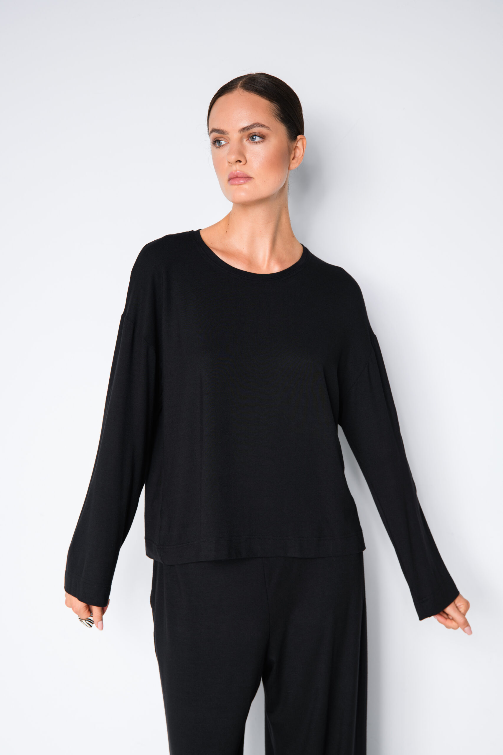 Czarna bluzka z modalu o luźnym kroju z długim rękawem. Materiał jest miękki, przewiewny i przyjemny dla skóry, a do tego nie gniecie się i zachowuje elegancki wygląd przez cały dzień. Luźny krój i okrągły dekolt sprawiają, że bluzka jest wygodna i pasuje do wielu okazji, od domowego relaksu po wyjście na miasto. W połączeniu ze spodniami Marva tworzy spójny komplet na jesień.