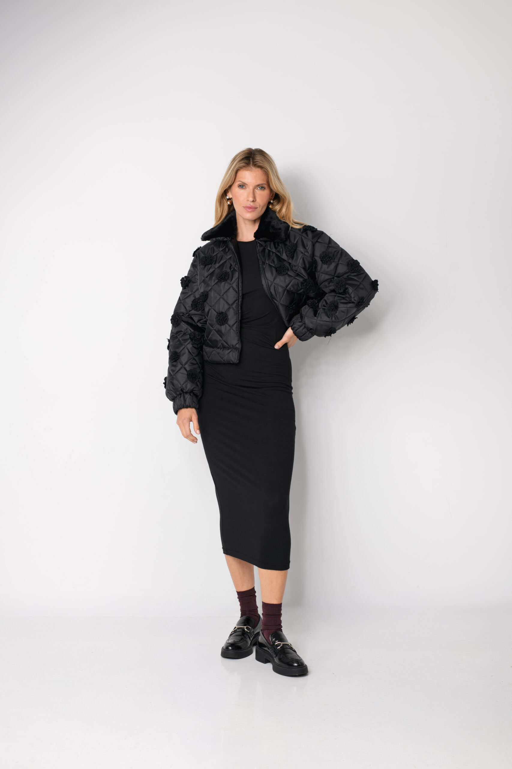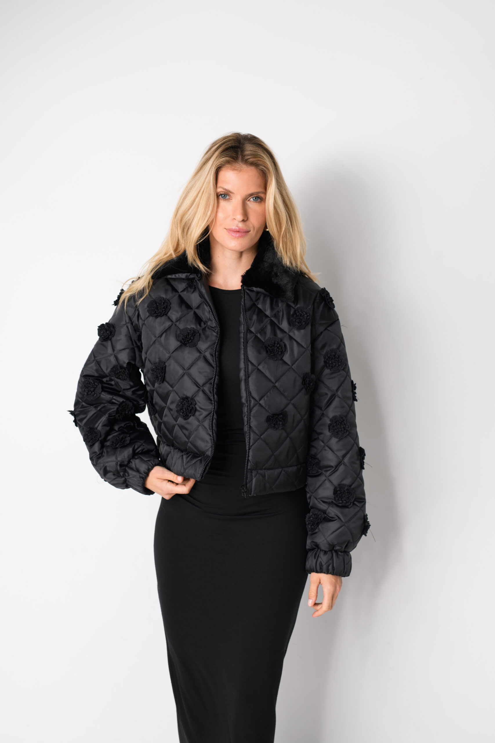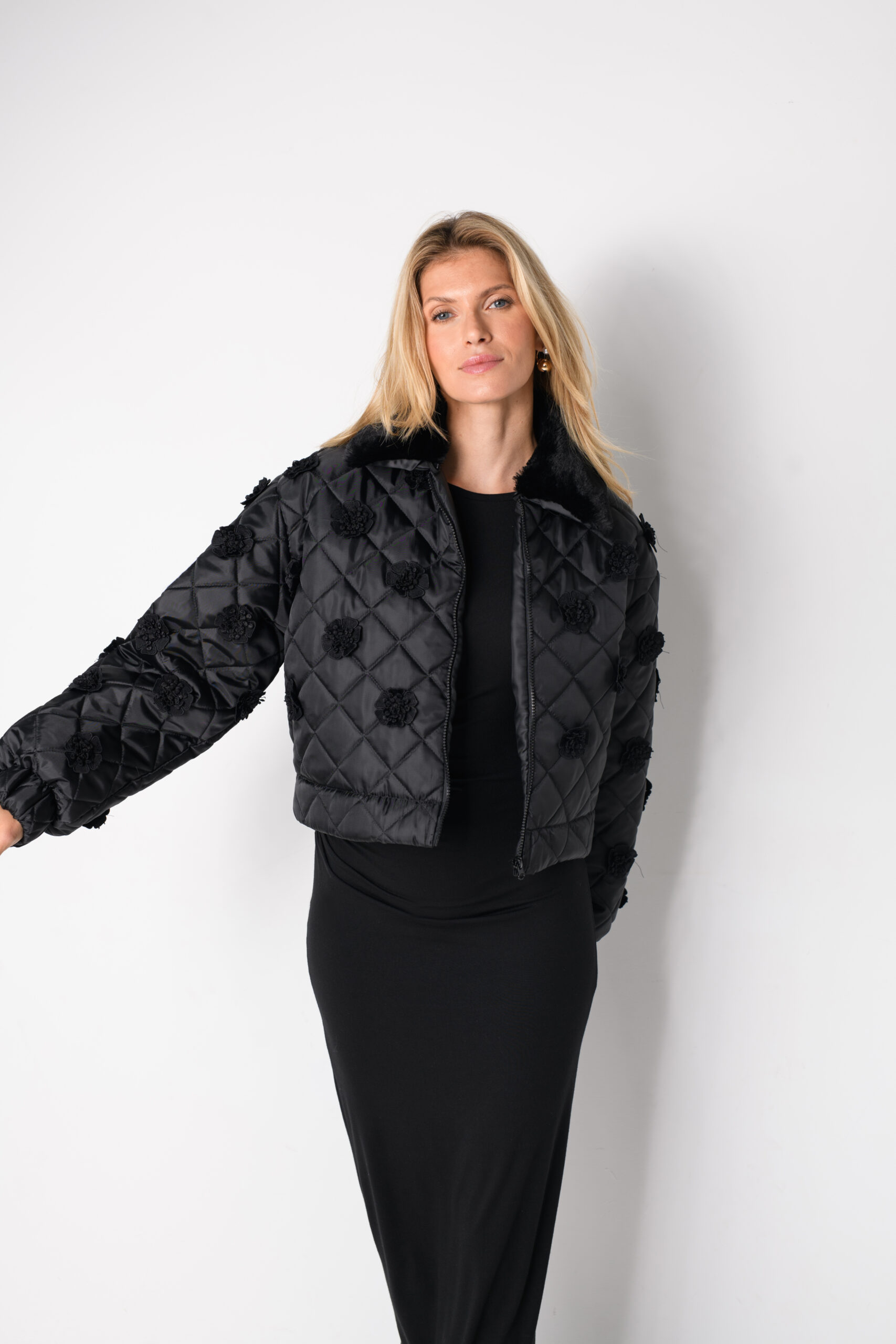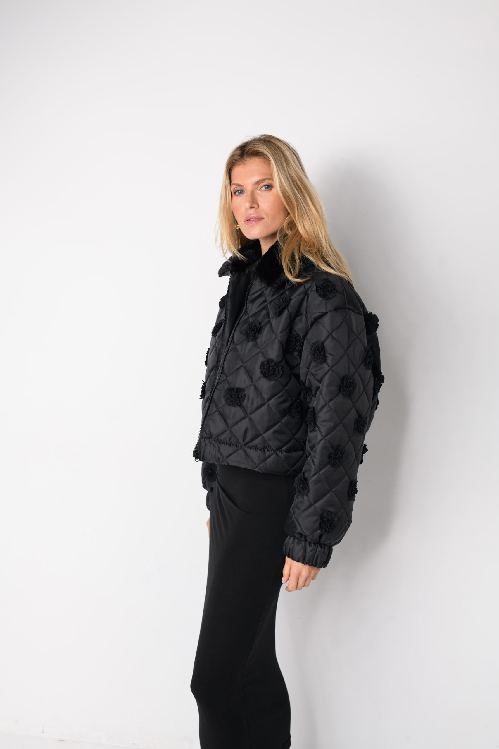 Czarna bomberka damska na jesień, ozdobiona aplikacjami w formie kwiatków. Model z kołnierzem wykończonym odpinanym futerkiem oraz białą naszywką z logo na rękawie. Zapinana na zamek, wykończona ściągaczami. Lekka i wygodna, idealna na chłodniejsze jesienne dni.