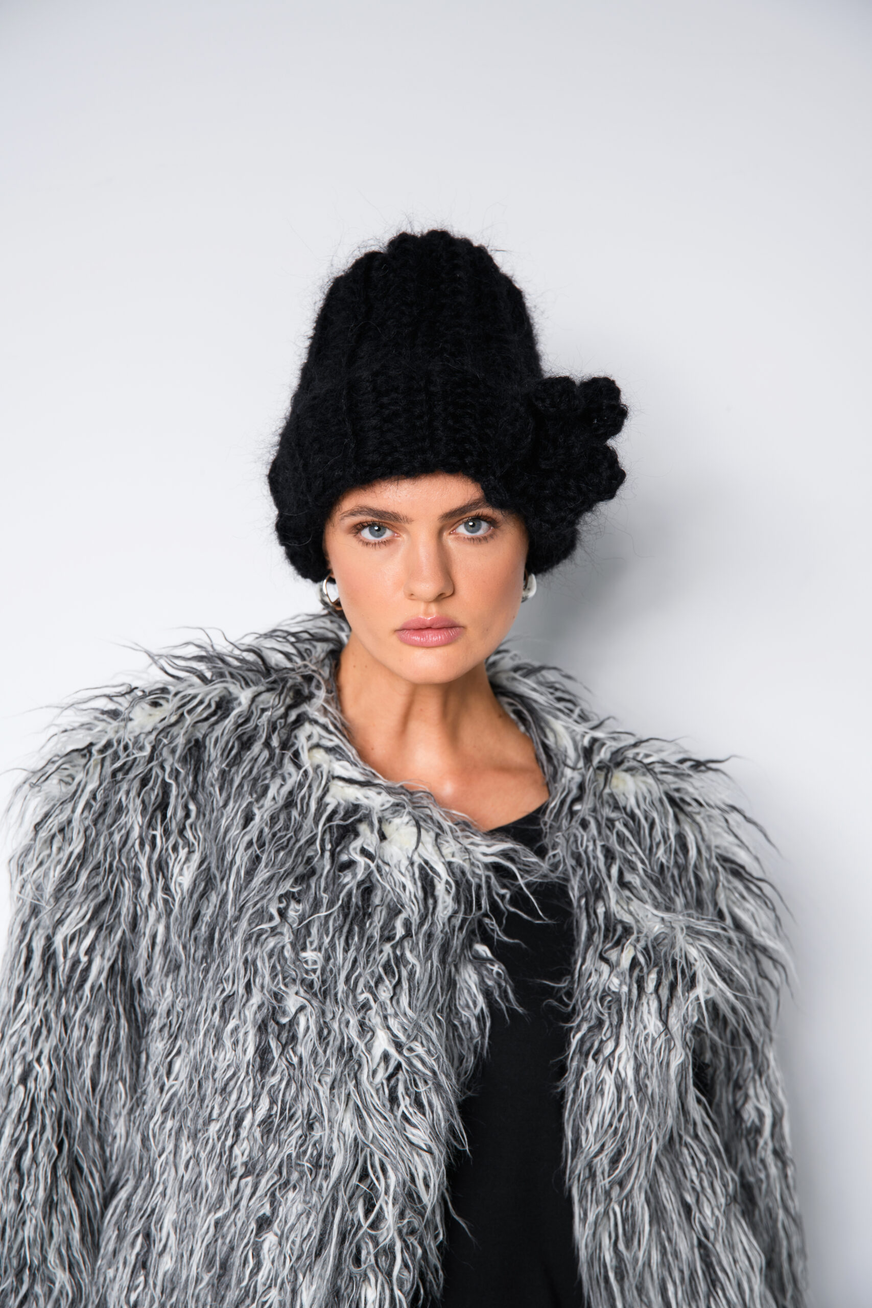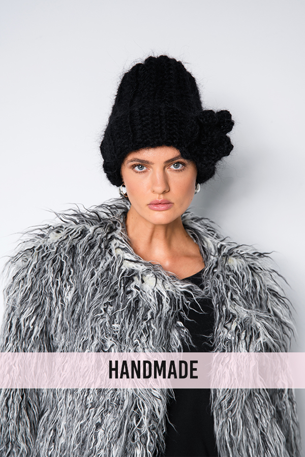 Czarna czapka damska handmade, szydełkowana przez projektantkę Dorotę Cieszyńską. Wykonana z wełny i moheru, ciepła, miękka i lekka. Ozdobiona kwiatowym detalem, pasuje zarówno do eleganckiego płaszcza, jak i futra.