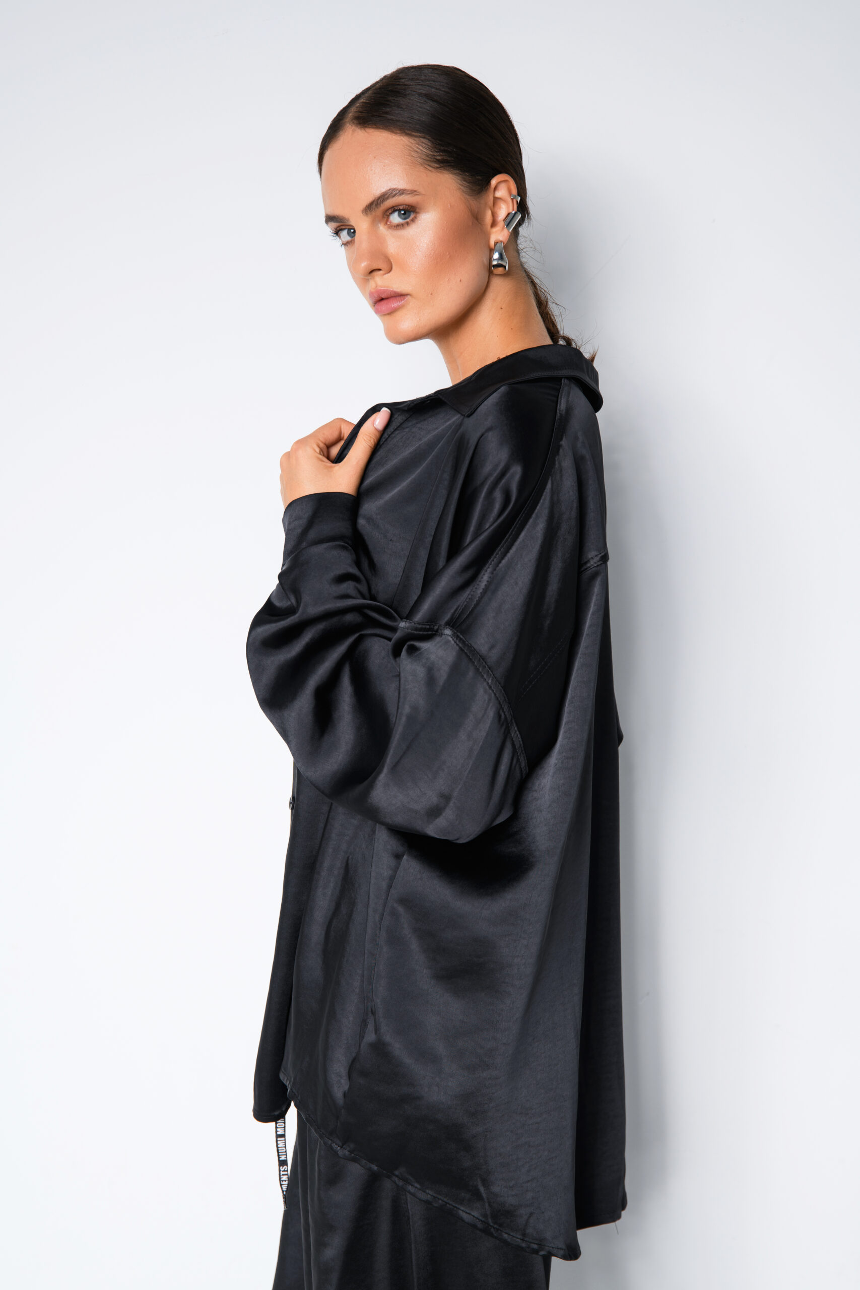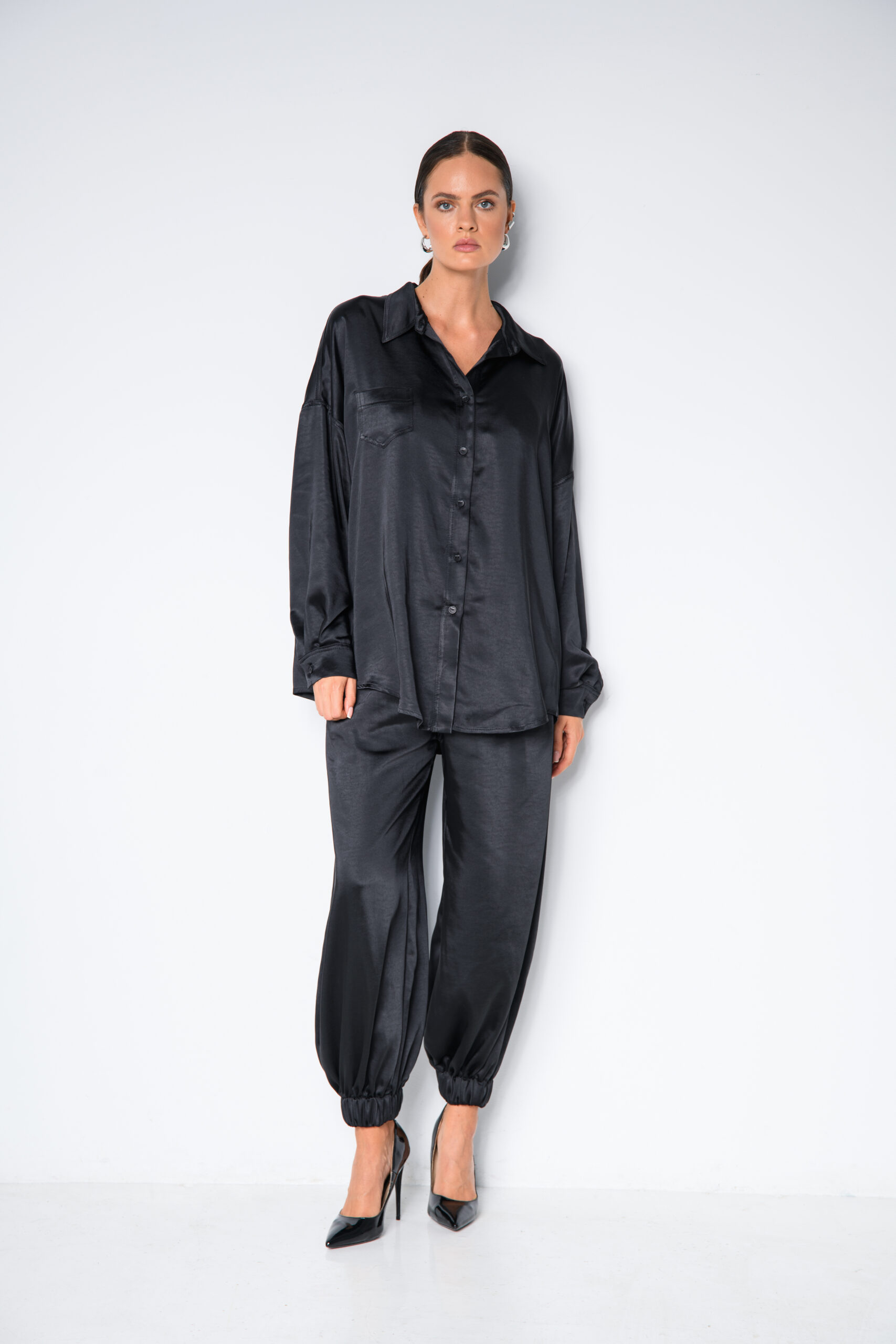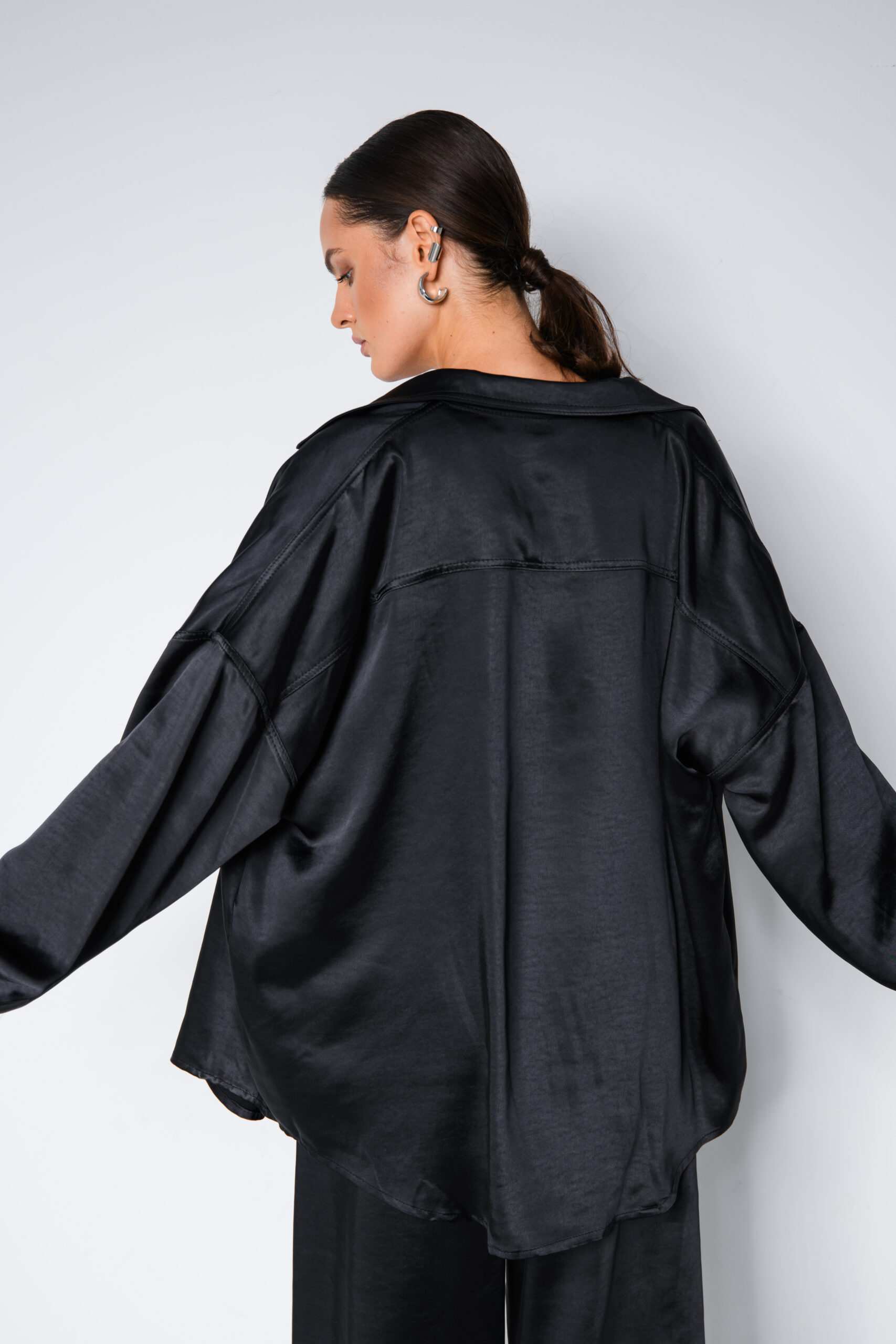 Czarna satynowa koszula damska, to długa koszula z przewagą wiskozy – miękka, lekka i bardzo wygodna. Idealnie sprawdzi się w jesiennych outfitach, dodając im elegancji i klasy. Satynowe wykończenie nadaje jej szyku, a uniwersalny krój pozwala nosić ją zarówno do pracy, na spotkania, jak i na wyjątkowe okazje. Możesz dopasować ją do naszych satynowych spodni balloon albo zestawić z satynowym topem z koronką i stworzyć stylowy komplet. To ponadczasowa propozycja, dzięki której zawsze będziesz wyglądać kobieco i modnie.