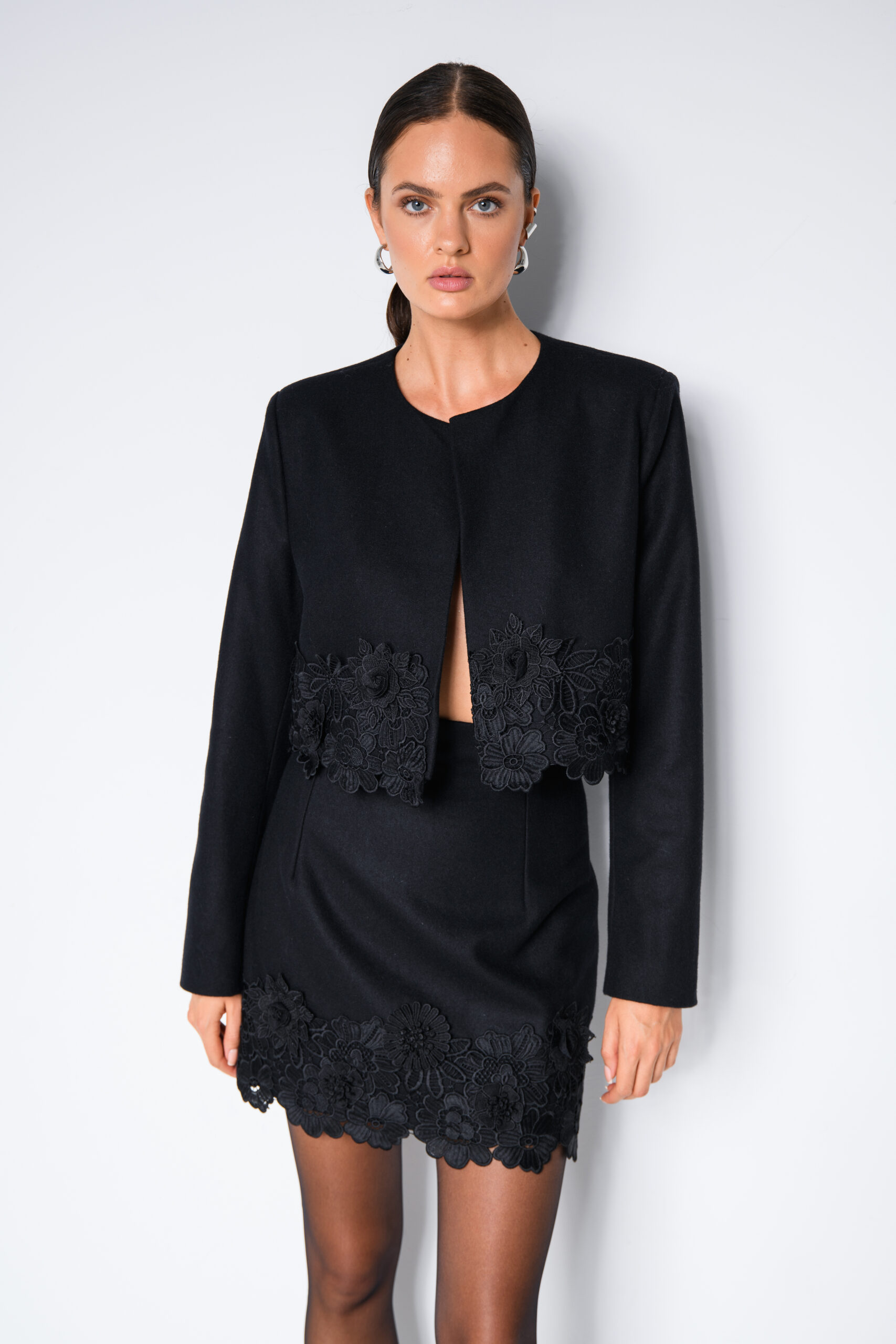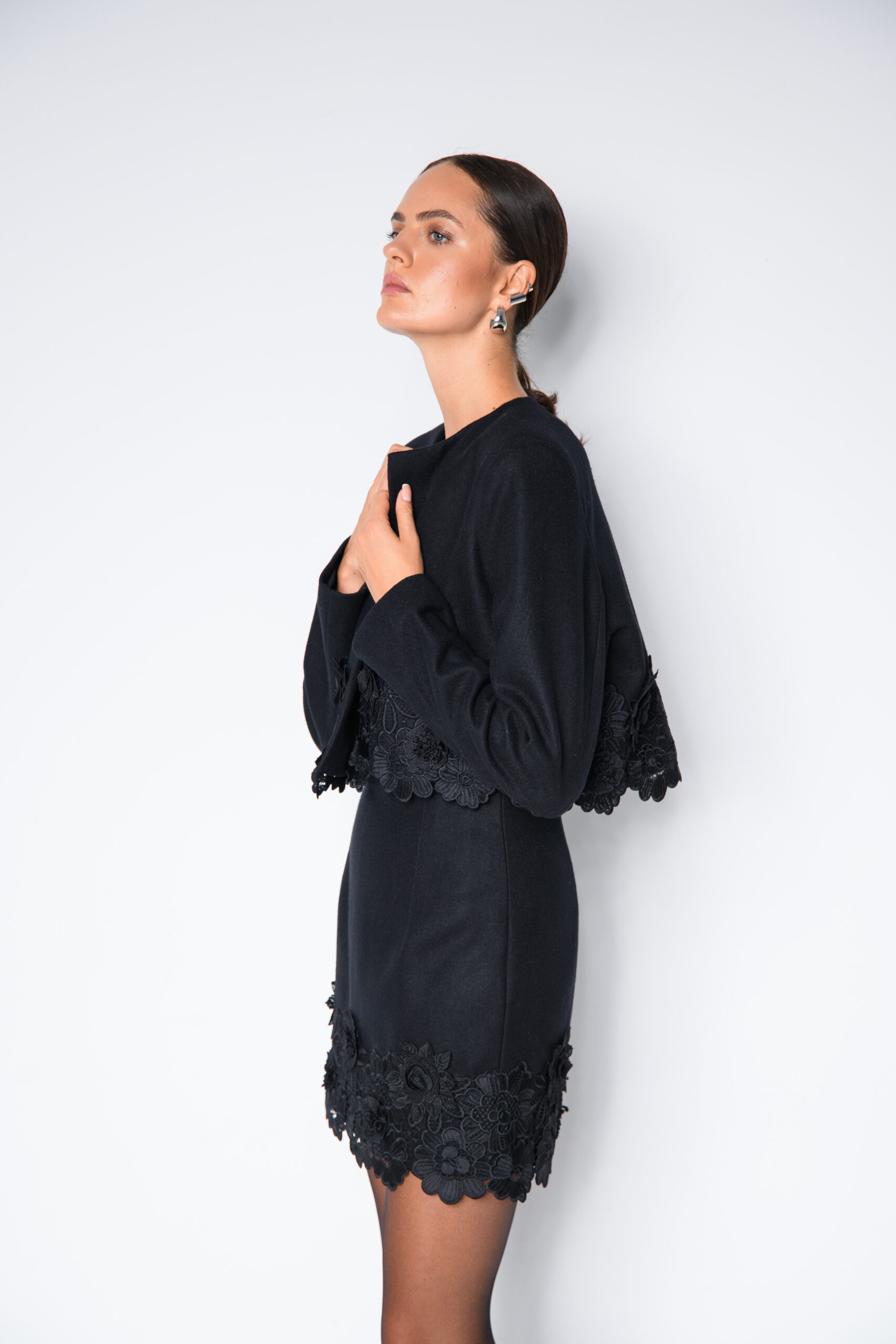 Czarna spódnica damska z koronką, wykonana z mieszanki wełny i wiskozy, ozdobiona ręcznie wycinanym haftem z bawełnianej koronki. Ma delikatnie podwyższony stan, który optycznie wydłuża nogi i podkreśla talię. Zapinana na zamek, z bawełnianą podszewką, zapewnia komfort noszenia i jest nieprześwitująca. To nowa wersja naszej bestsellerowej spódnicy Lavinia, która w komplecie z kurtką Lavinia Black tworzy spójny zestaw. Spódnica świetnie sprawdzi się solo lub w połączeniu z ulubionymi dodatkami.