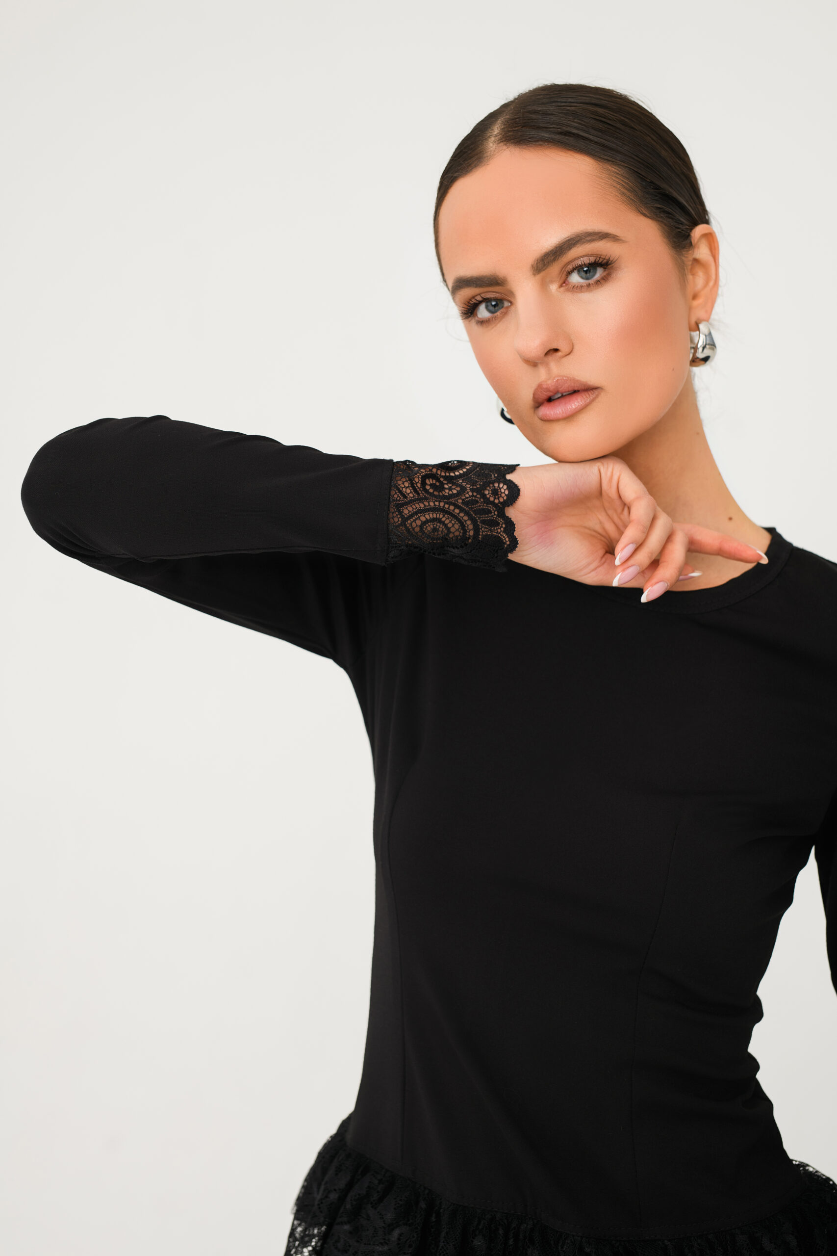 Czarna sukienka z falbanami to nowa odsłona sukienki Aveline, tym razem w wersji z długim rękawem. Sukienka ma koronkowo-tiulowe falbany, a gładka góra ładnie podkreśla sylwetkę. Materiał z przewagą wiskozy jest miękki i przyjemny w dotyku, a rękawy wykończone koronką dodają elegancji.