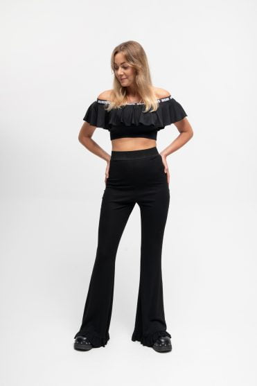 - Elegancka Wieczorowa Stylizacja: Czarne dzwony można zestawić z elegancką koszulą i szpilkami na obcasie, tworząc wyjątkową wieczorową stylizację. Dodaj minimalistyczną biżuterię i kopertówkę, aby podkreślić elegancję.