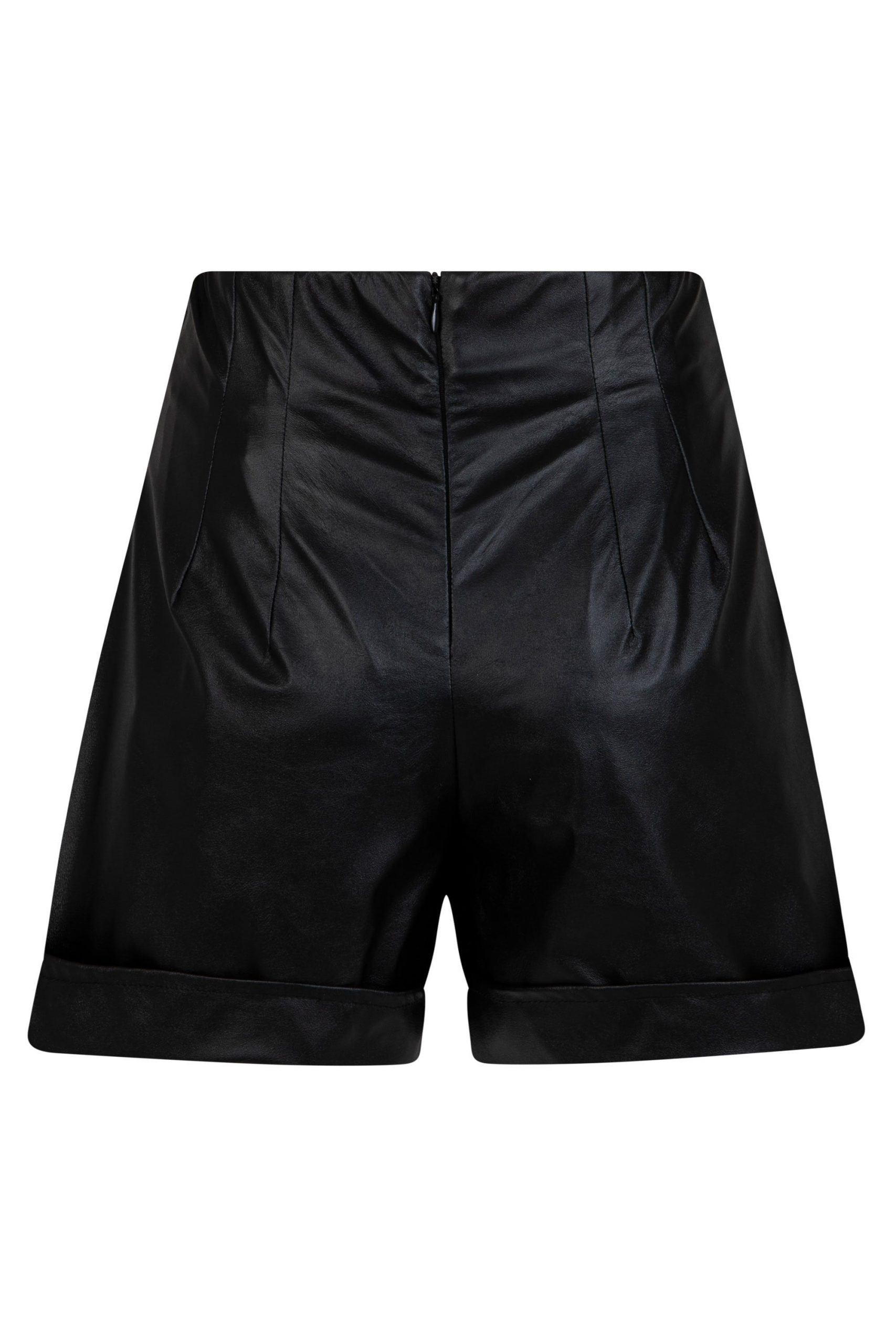 Czarne proste szorty wykonane z ekoskóry. Klasyczny krój i kolor przełamane odważnym materiałem. Będą idealnym elementem zarówno dziennych stylizacji jak i outfitów na specjalne okazje.