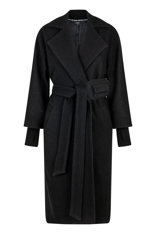 Klasyczny czarny płaszcz wykonany w 100% z wełny. Model idealny na późną jesień oraz zimę. Pasek wiązany w talii możesz nosić z zakładaną saszetką lub bez. Plecy ozdobione haftowaną szarfą NIUMI w kolorze płaszcza. Rękawy zakończone długim ściągaczem, który doskonale ociepli dłonie.