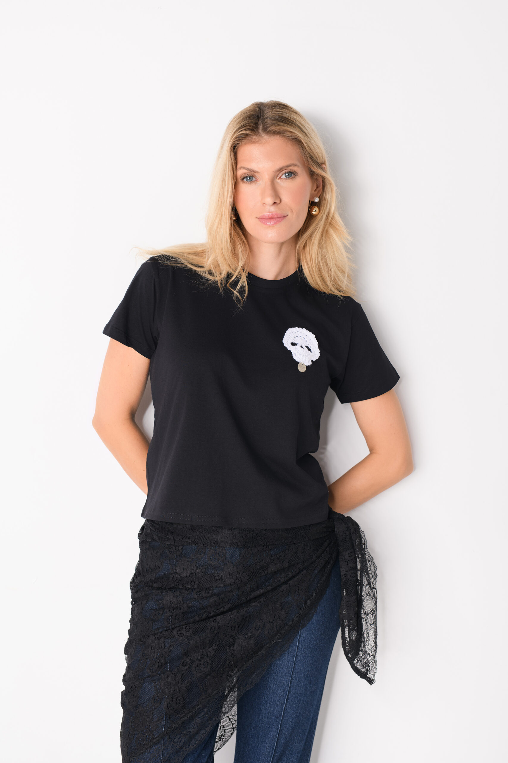 Czarny t-shirt halloween damski wykonany z bawełnianej tkaniny. Zdobiony naszytą szydełkowaną czaszką oraz metalowym pieniążkiem Niumi. Wygodny, przewiewny i łatwy w stylizacji, świetnie sprawdzi się w jesiennych outfitach.