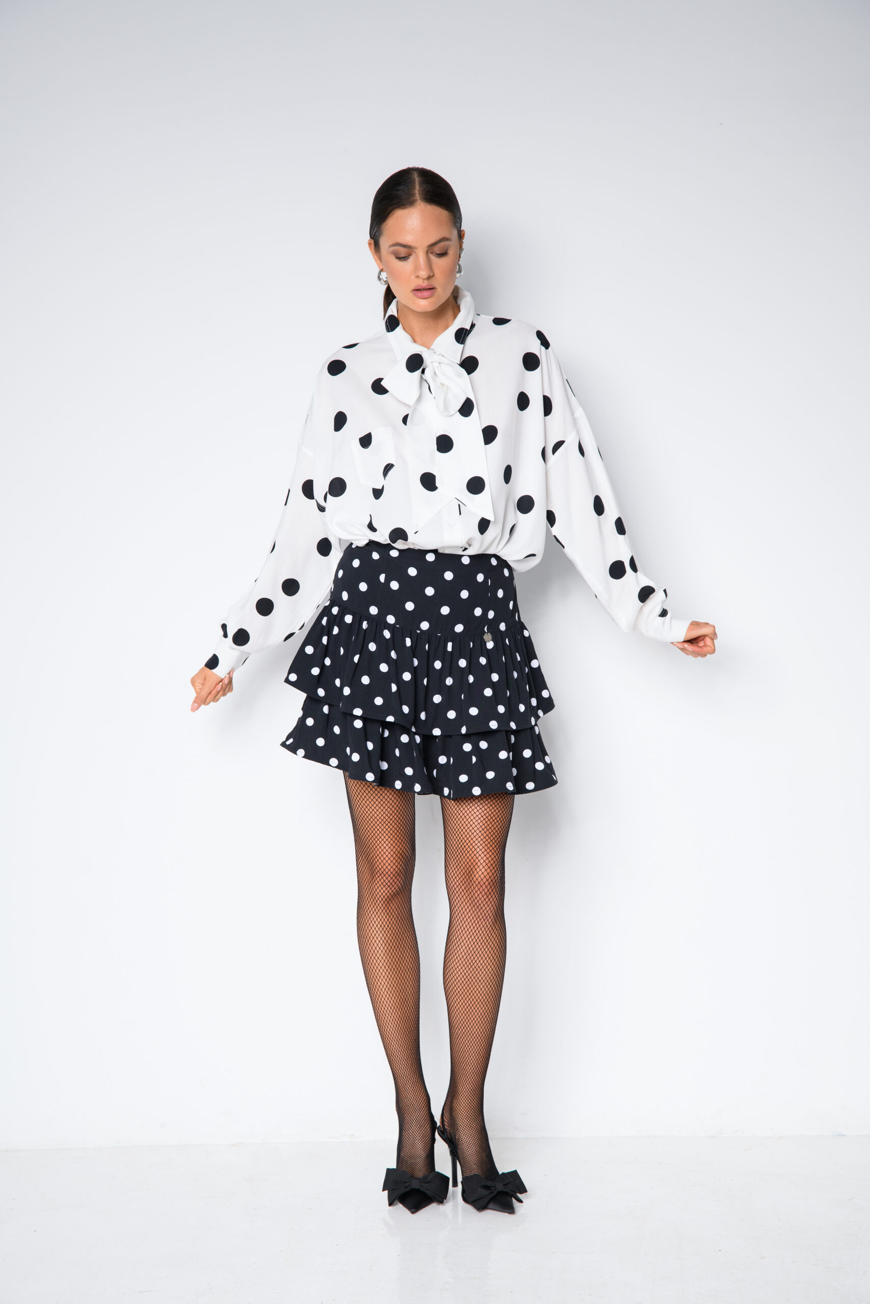 Damska koszula w grochy z kokardą to kobieca propozycja na jesień. Wiskoza sprawia, że koszula jest przyjemna w dotyku i komfortowa przez cały dzień. Kokardę możesz zawiązać przy szyi, na boku lub pozostawić luźno opadającą, co daje różne możliwości stylizacji. Świetnie komponuje się z naszymi czarnymi szortami w białe grochy, tworząc spójny jesienny zestaw. Koszula ma ponadczasowy fason i jest wygodna w noszeniu.