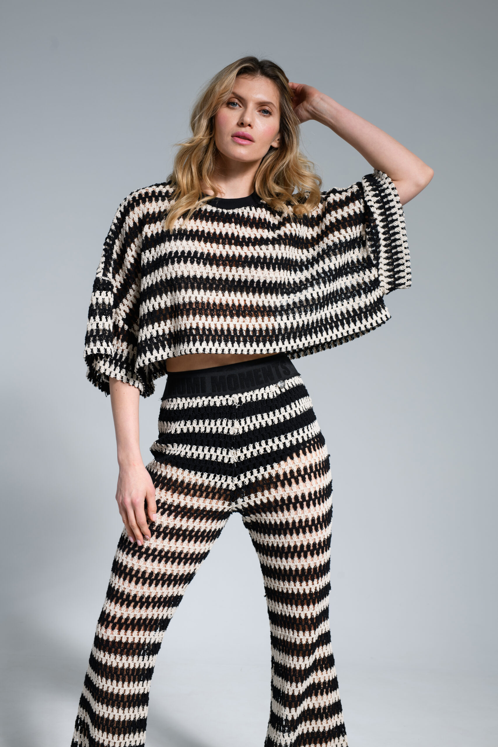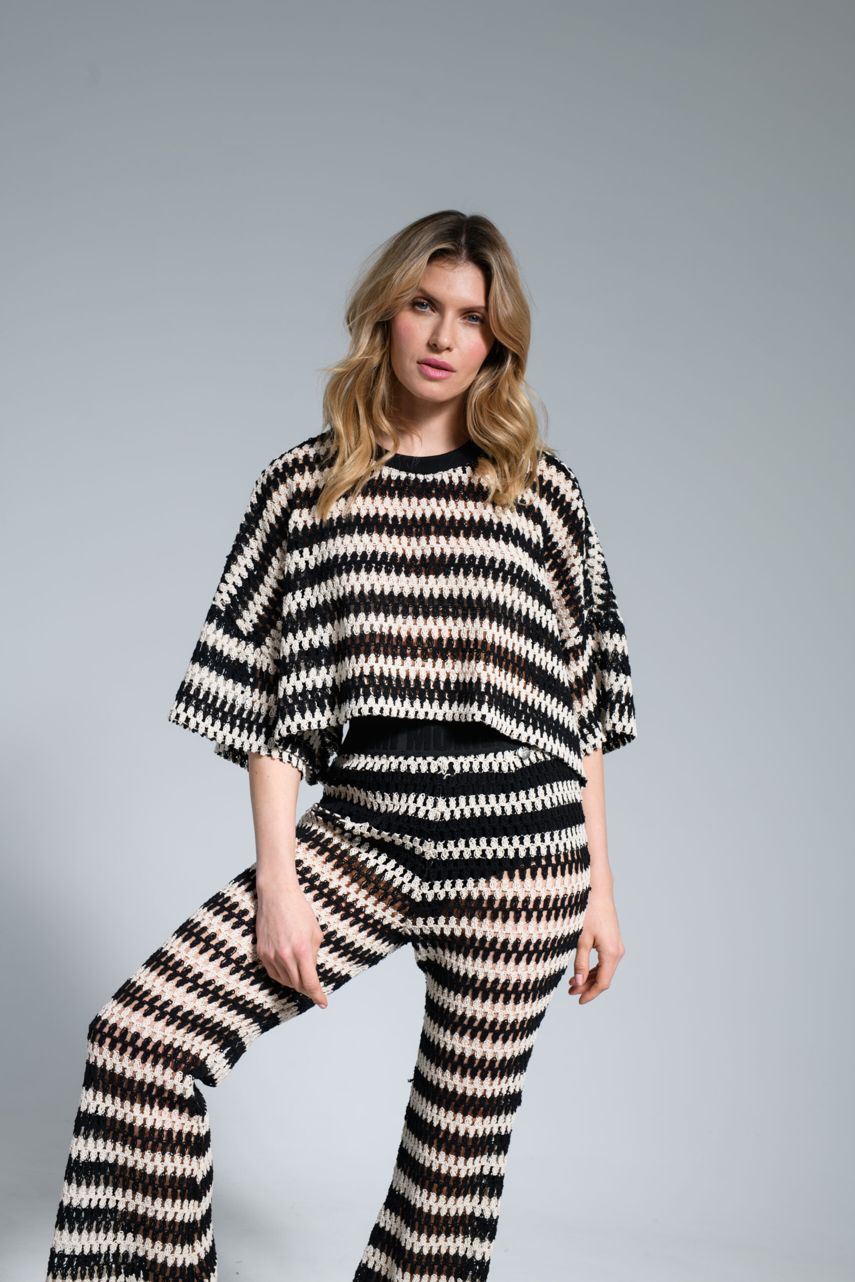 Damski t-shirt w paski z napisem to luźny, pudełkowy fason wykonany z przewiewnej, lekkiej tkaniny imitującej szydełkowy splot. Połączenie czerni z naturalnym beżem tworzy stylowy kontrast, a ręcznie robiony napis Niumi z przodu dodaje charakteru. Dekolt wykończony jest prążkowanym ściągaczem z dzianiny, co nadaje całości wygodnego, casualowego looku. T-shirt świetnie prezentuje się na plażowy kostium, ale równie dobrze pasuje do białych spodni – idealny wybór na modne stylizacje na lato.