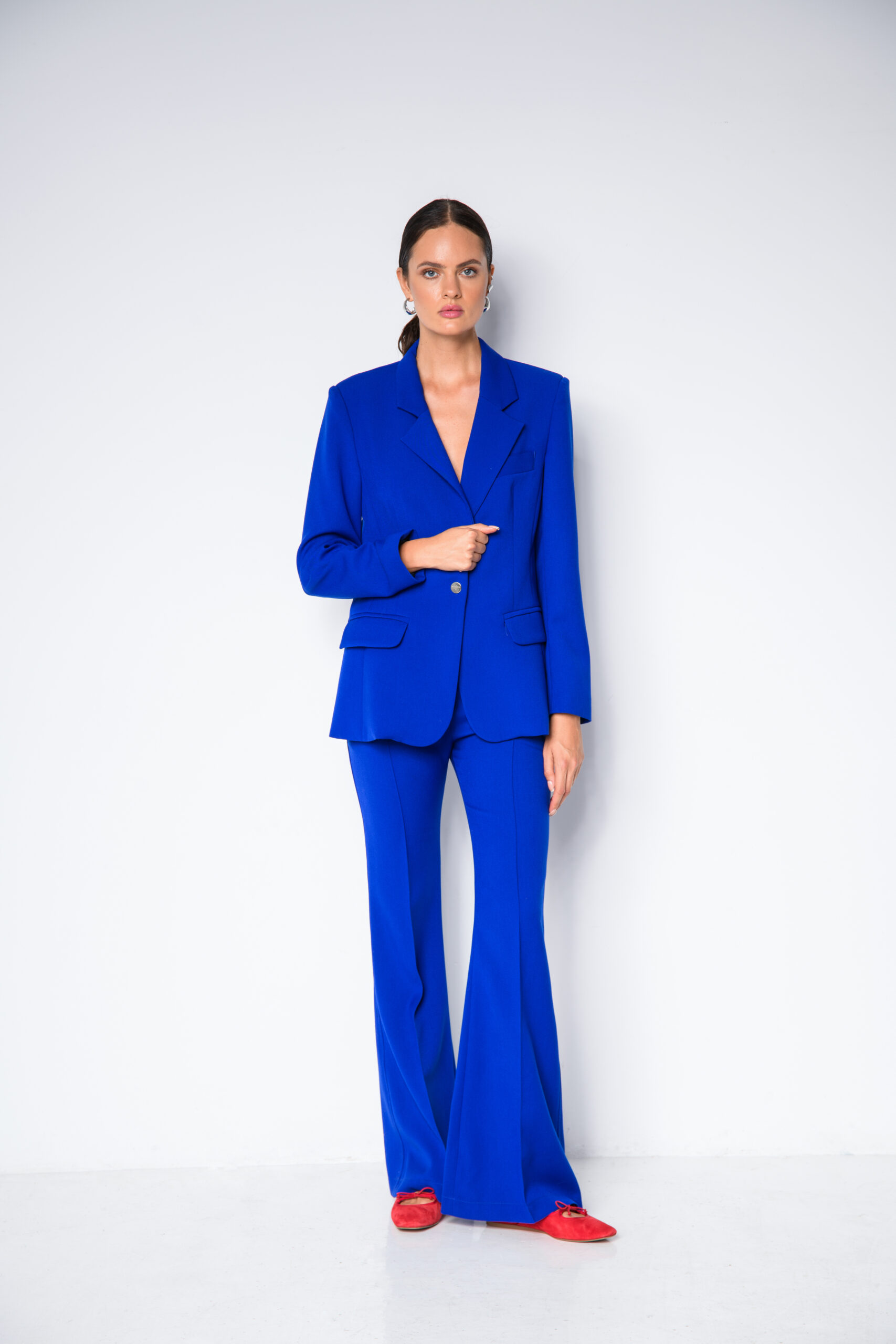 Damskie spodnie garniturowe w chabrowym kolorze wykonane z wysokiej jakości materiałów, gwarantują komfort noszenia i świetne dopasowanie. Spodnie dzwony są absolutnym hitem tego sezonu, a chabrowy kolor dodaje im niepowtarzalnego uroku. Dzięki nim poczujesz się jak prawdziwa gwiazda mody, inspirująca się stylem francuskich fashionistek. Doskonale będą się komponować z naszą koszulą i marynarką Emili jako monochromatyczna całość.