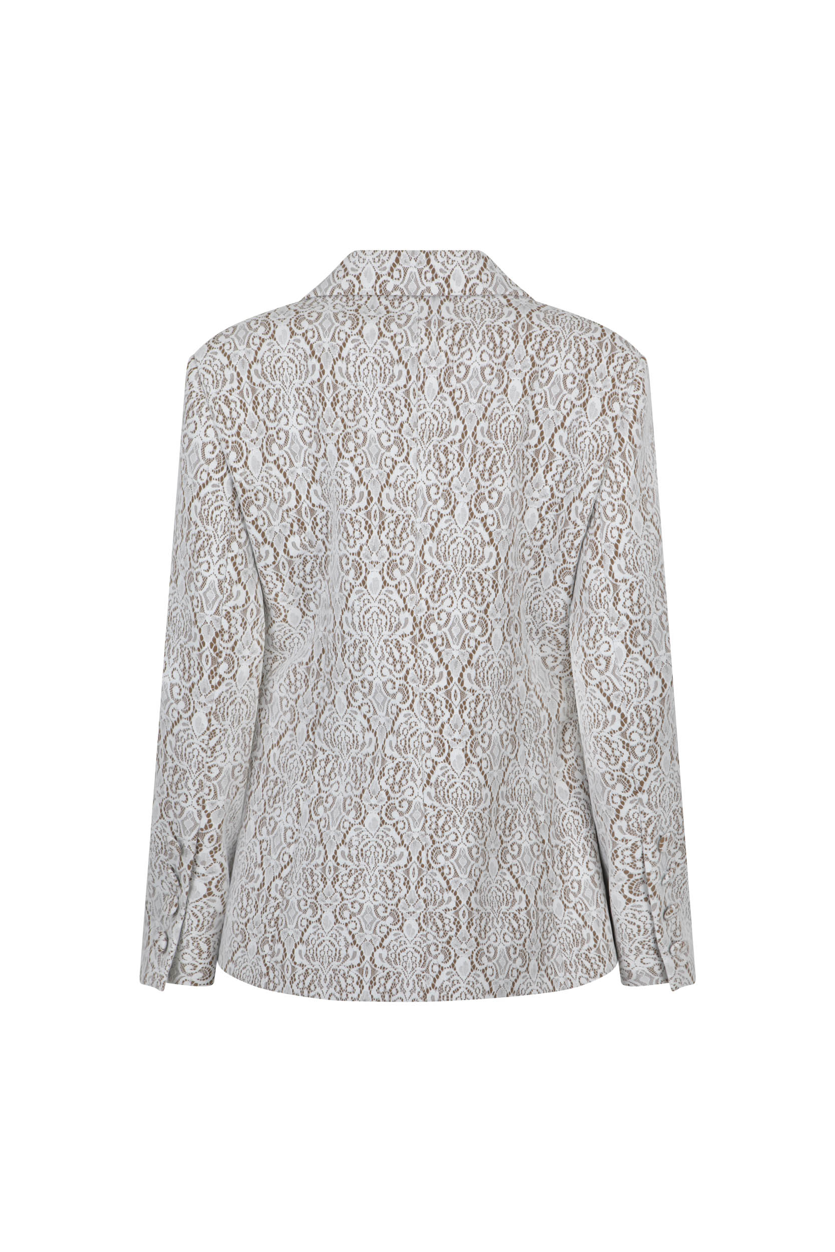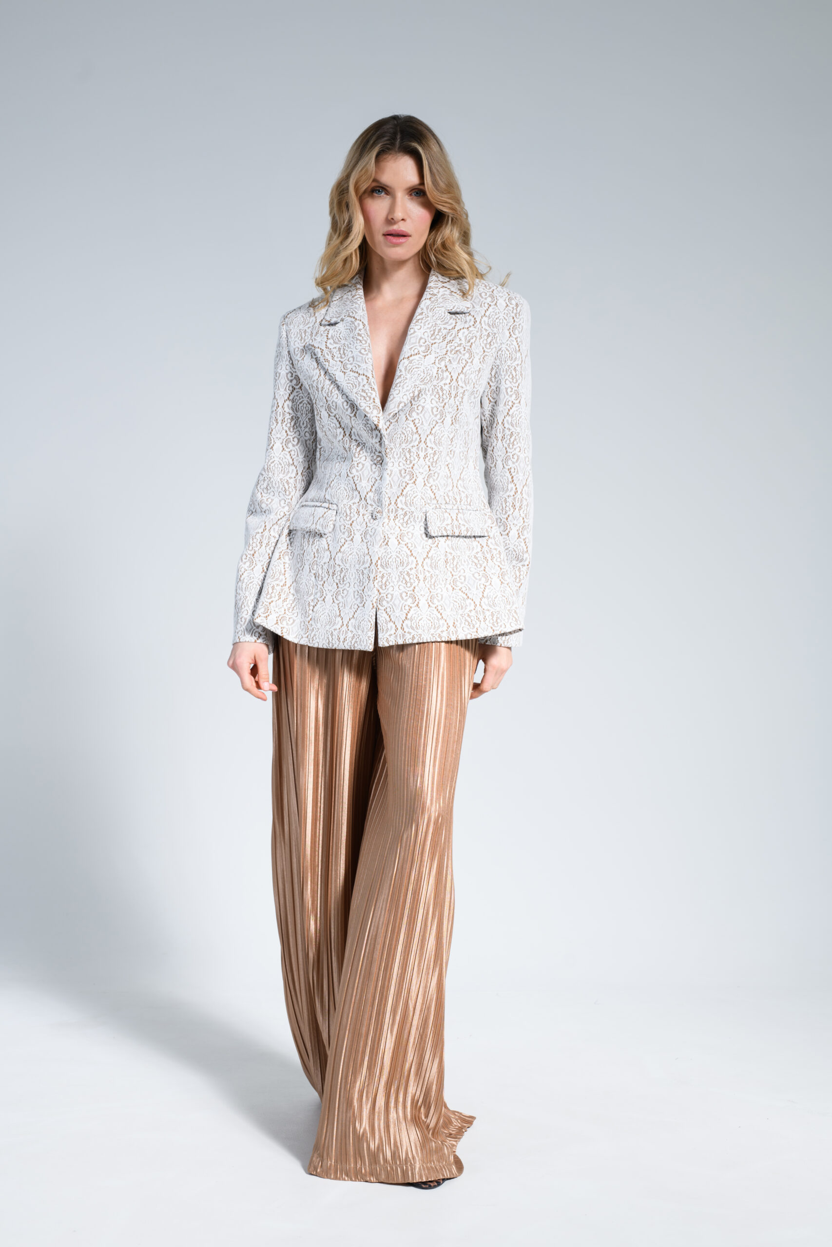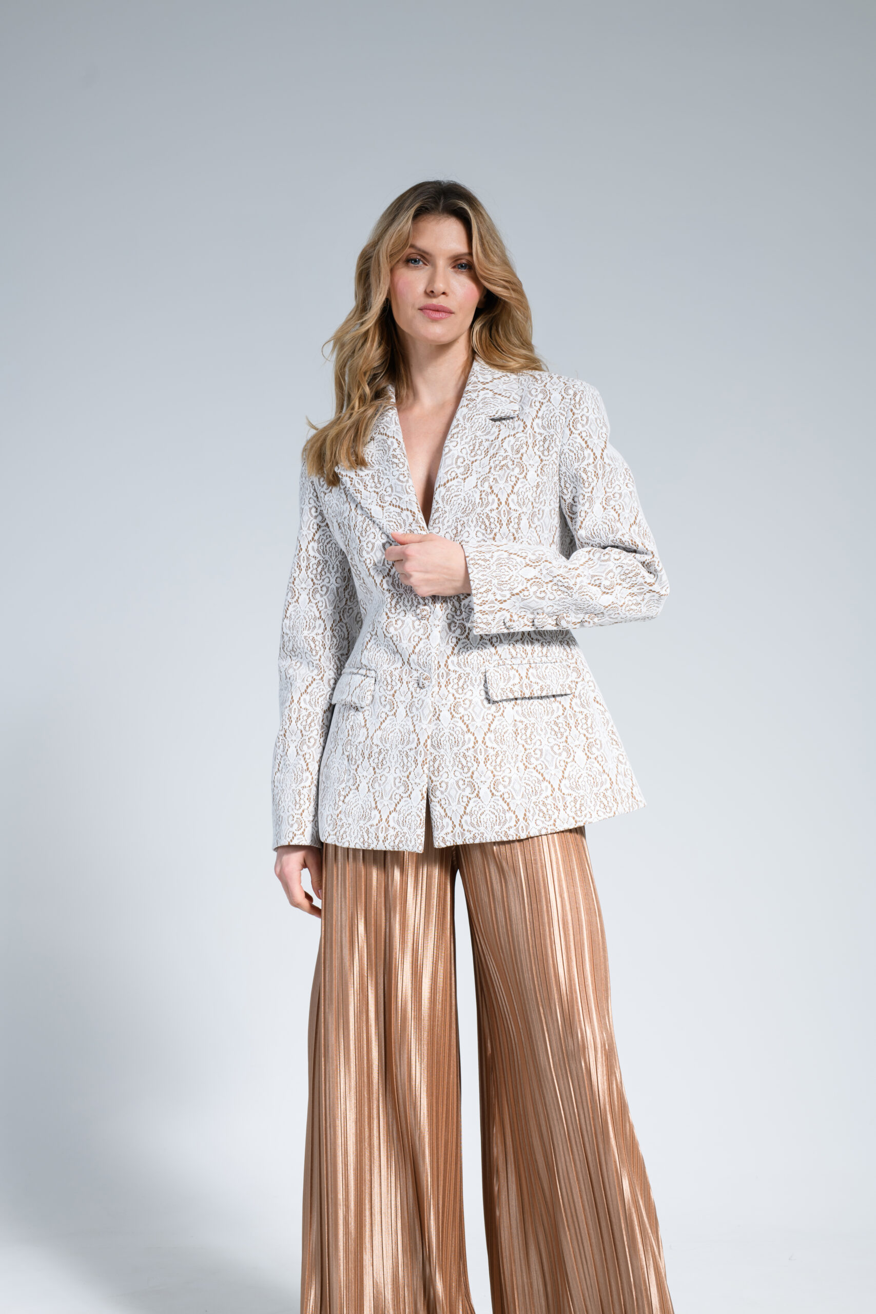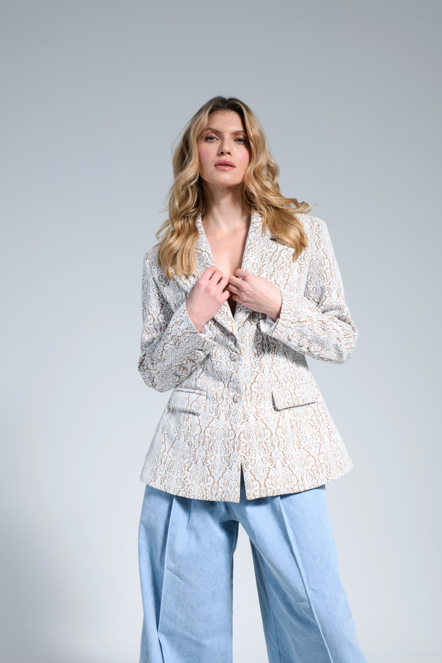 Dopasowana marynarka z koronki. Wykonana z tkaniny na jasnej podszewce, zachwyca delikatnym wzorem i wyrafinowanym wykończeniem. Taliowany krój pięknie podkreśla sylwetkę, a zapięcie na trzy guziki dodaje klasycznego charakteru. To model, który sprawdzi się zarówno w eleganckich stylizacjach do biura, jak i jako szykowny dodatek do casualowych outfitów.