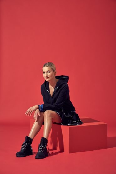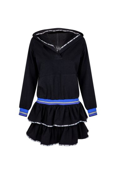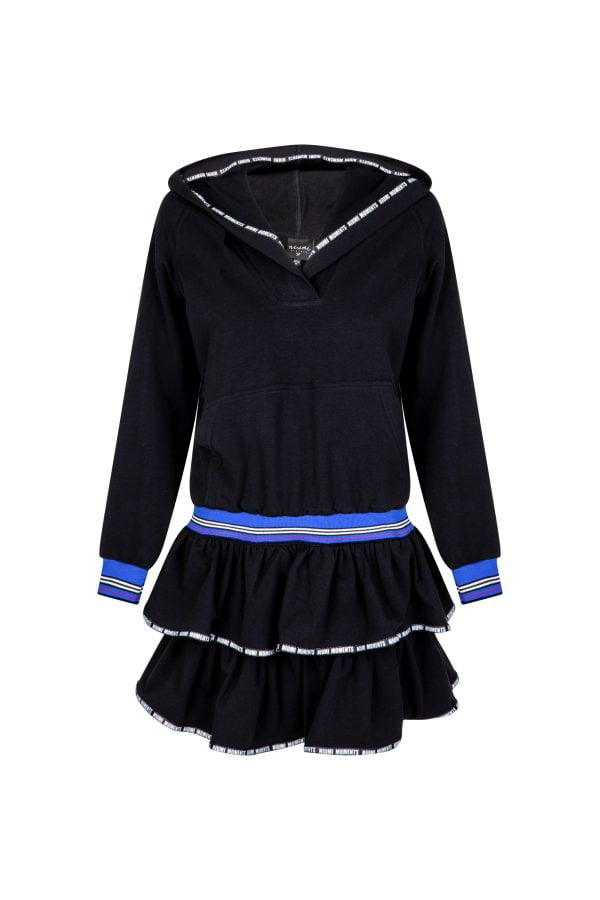 Dresowa sukienka z falbanami i kapturem w bardzo kobiecym wydaniu. Trzy falbany wykończone logowaną lamówką połączone ściągaczem z górą w formie bluzy. Dzięki temu długość może być dopasowana  do każdej sylwetki. Góra sukienki Modern to bluza z dużym otulającym kapturem.