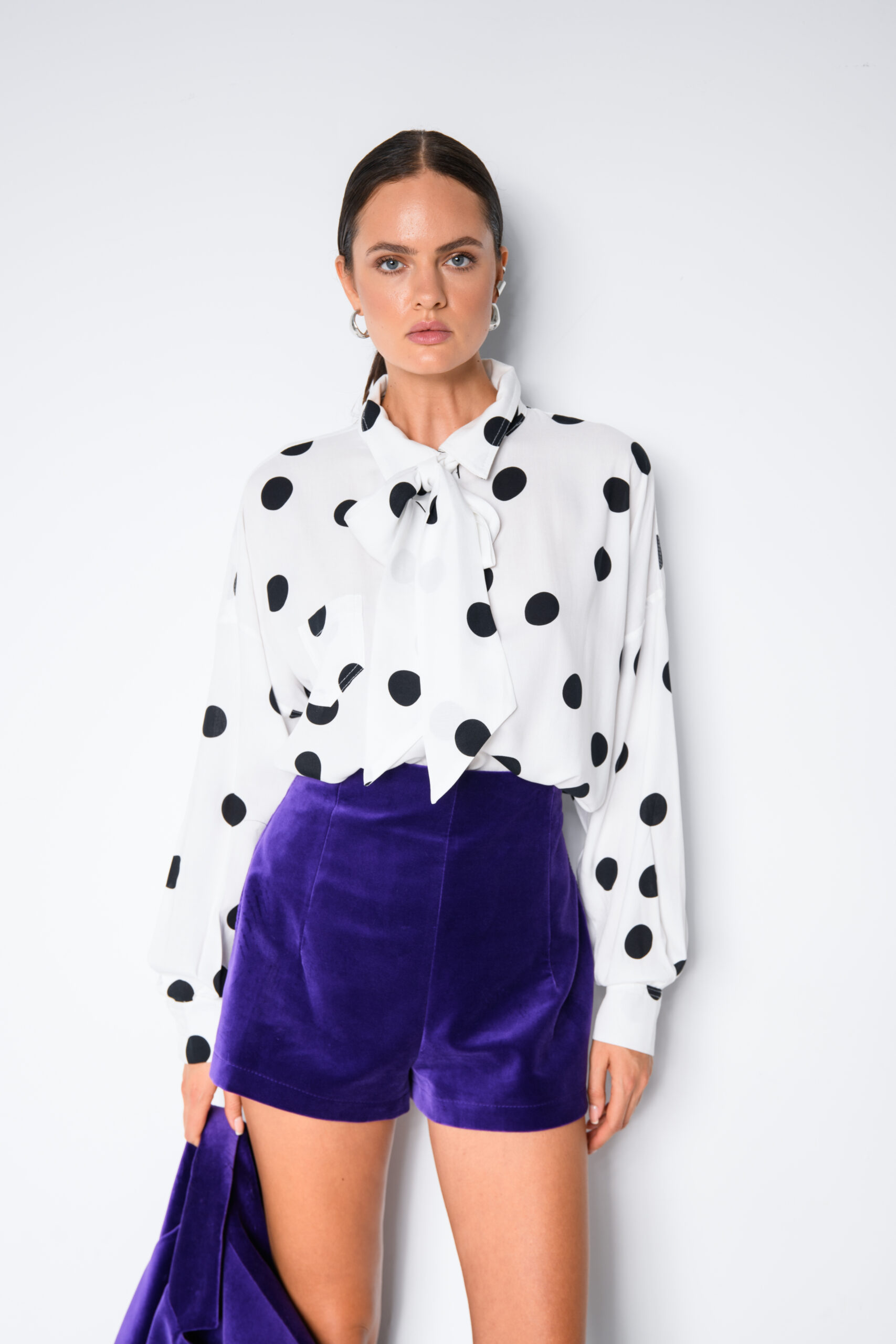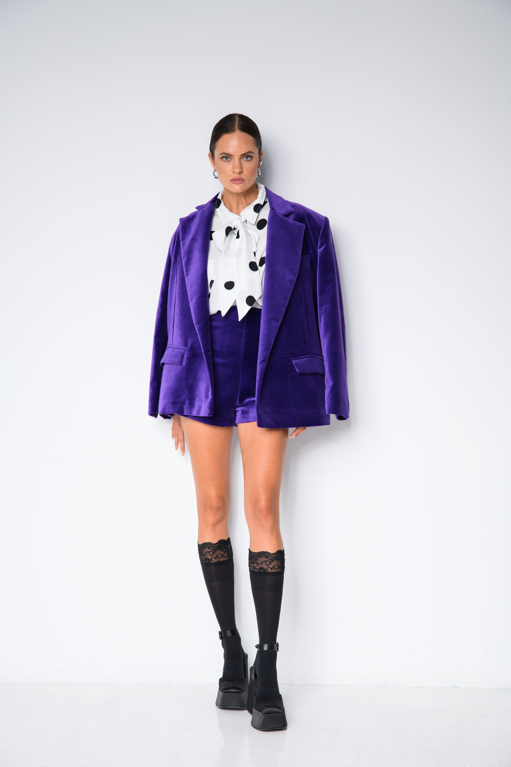 Fioletowe szorty damskie z kolekcji Jesień 2025 to idealne uzupełnienie codziennych stylizacji. Wykonane z bawełnianego aksamitu są miękkie w dotyku i przyjemne w noszeniu, a ich lekka faktura sprawia, że świetnie sprawdzają się w chłodniejsze dni. W duecie z marynarką Lovie tworzą idealny komplet na jesień, a w połączeniu z koszulą lub bluzką pozwalają tworzyć różnorodne, efektowne stylizacje. Z tyłu zapinane są na zamek, co zapewnia wygodne dopasowanie.