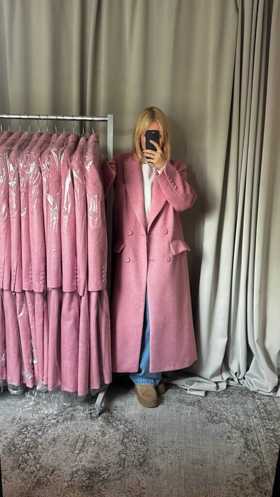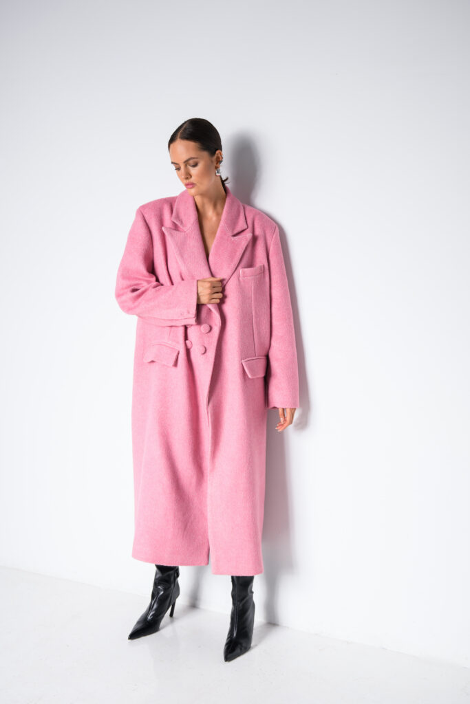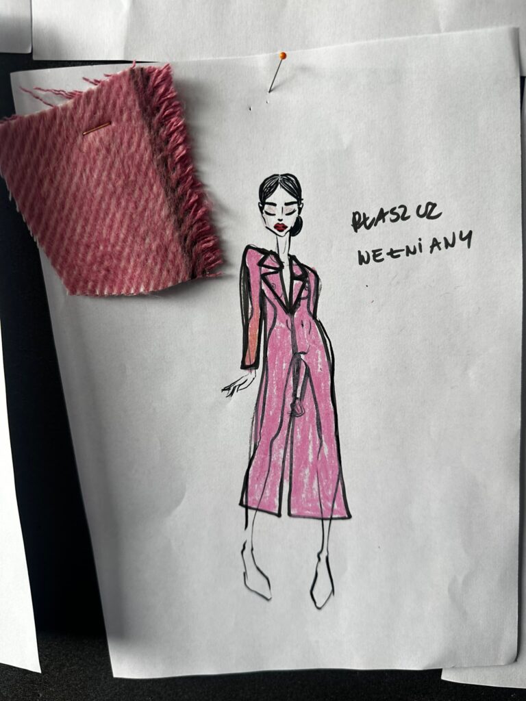 Ten płaszcz to efekt długich poszukiwań i wielu prób, które zaczęły się jeszcze w zeszłym roku. Wiedziałyśmy, że chcemy stworzyć coś wyjątkowego – odcień różu, który nie będzie przesłodzony, ale wciąż kobiecy i świeży. Przez długi czas nie mogłyśmy znaleźć odpowiedniej tkaniny. Nawet myślałyśmy o farbowaniu wełny, ale ryzyko wpadki było zbyt duże. W tym sezonie w końcu trafiłyśmy na materiał, który spełnił wszystkie nasze oczekiwania – miękki, ciepły, z idealnym odcieniem cukierkowego różu, który wygląda pięknie zarówno w naturalnym świetle, jak i w miejskiej scenerii.