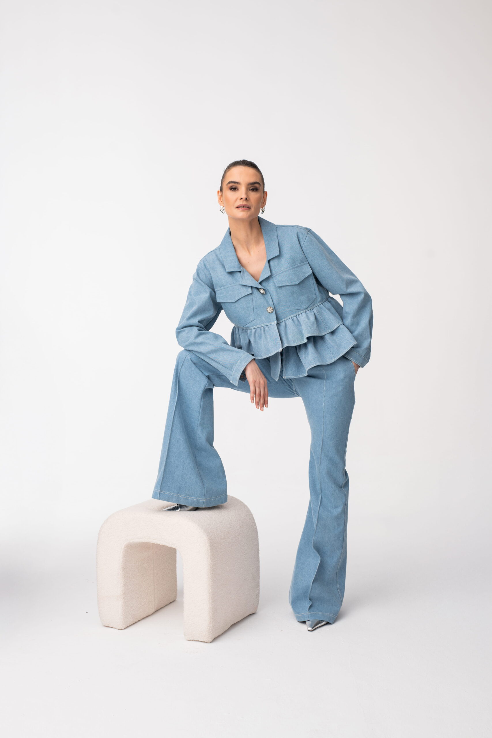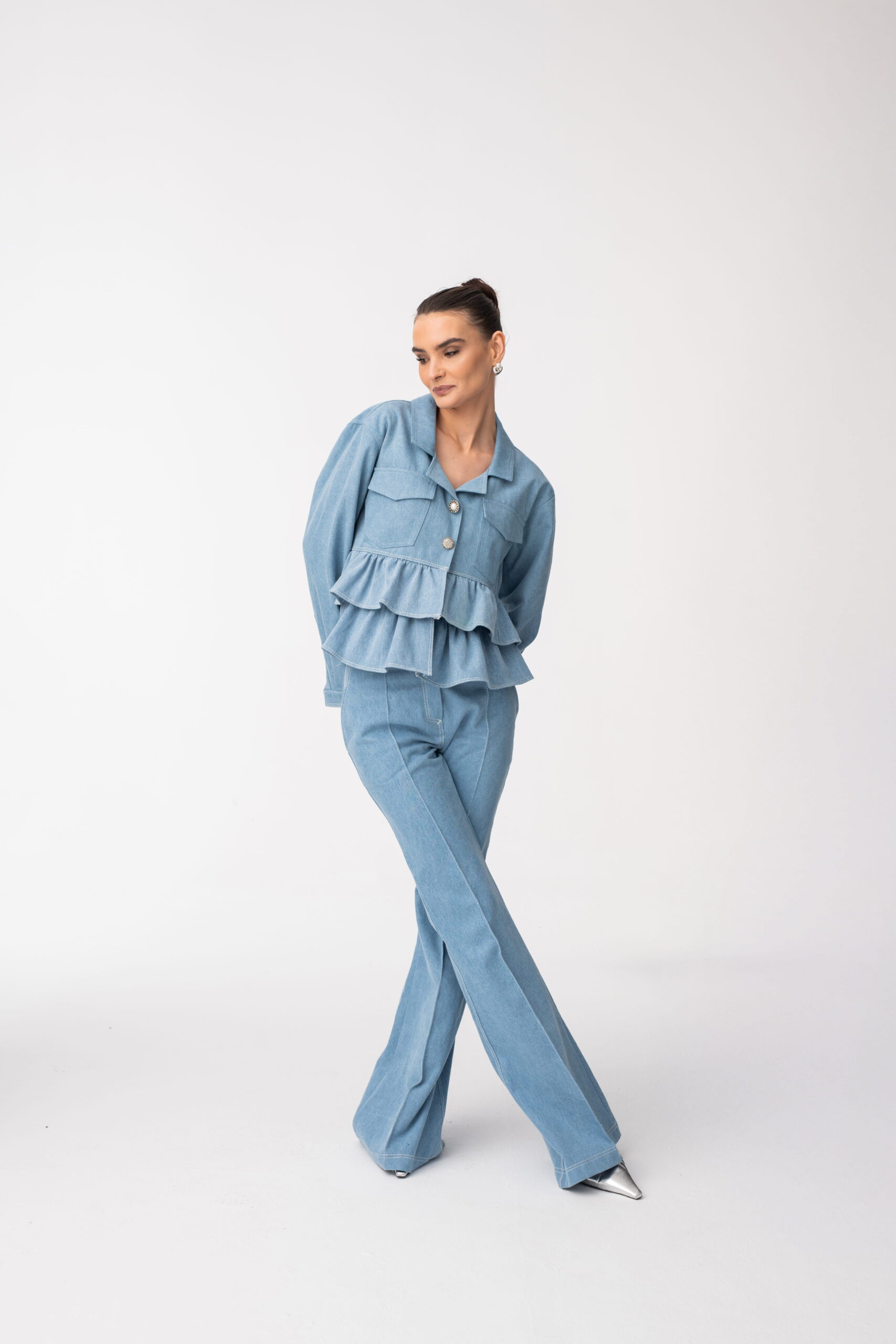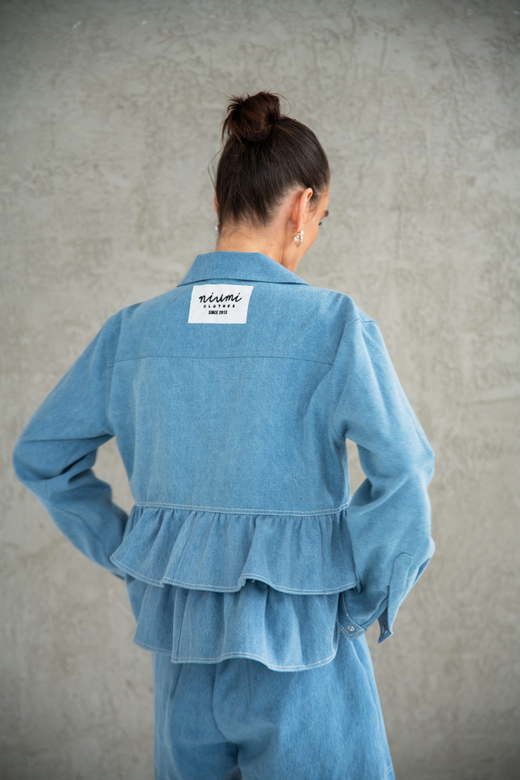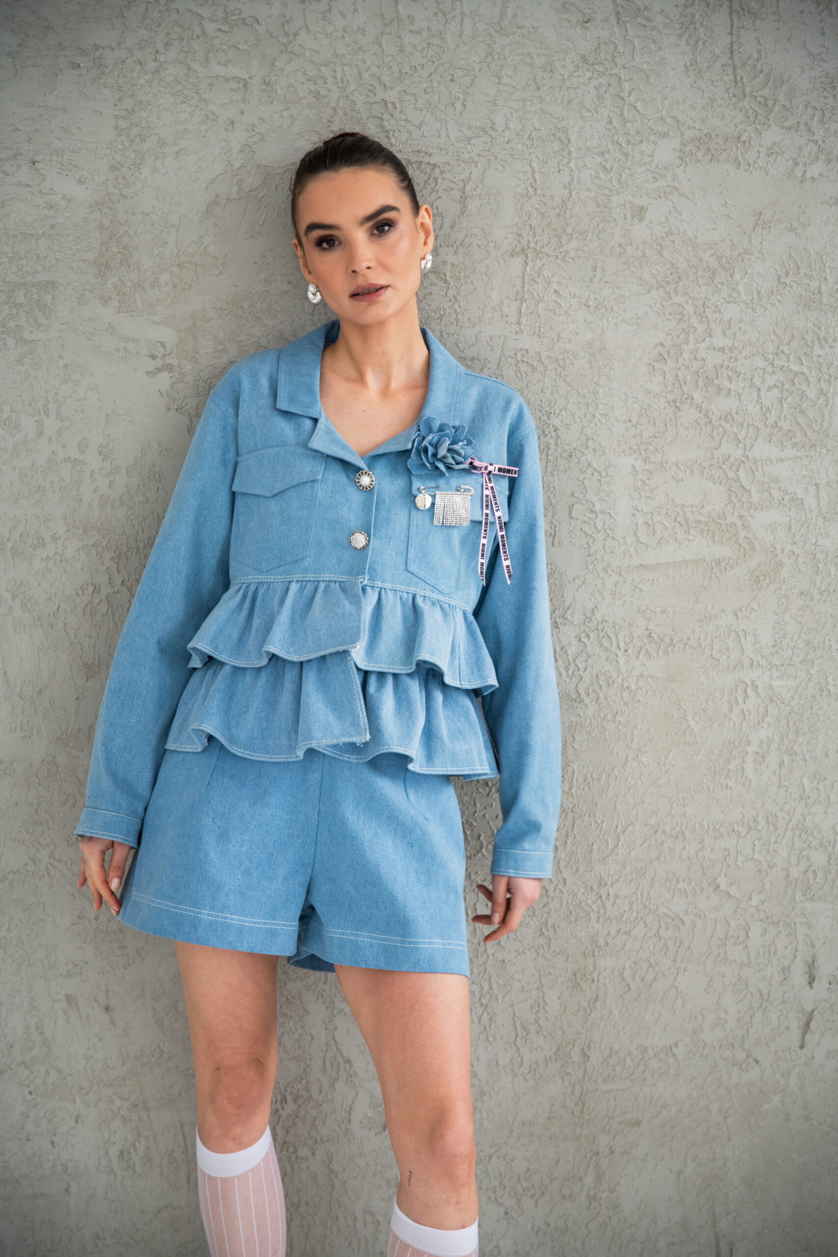 Jeansowa kurtka damska z falbanami
