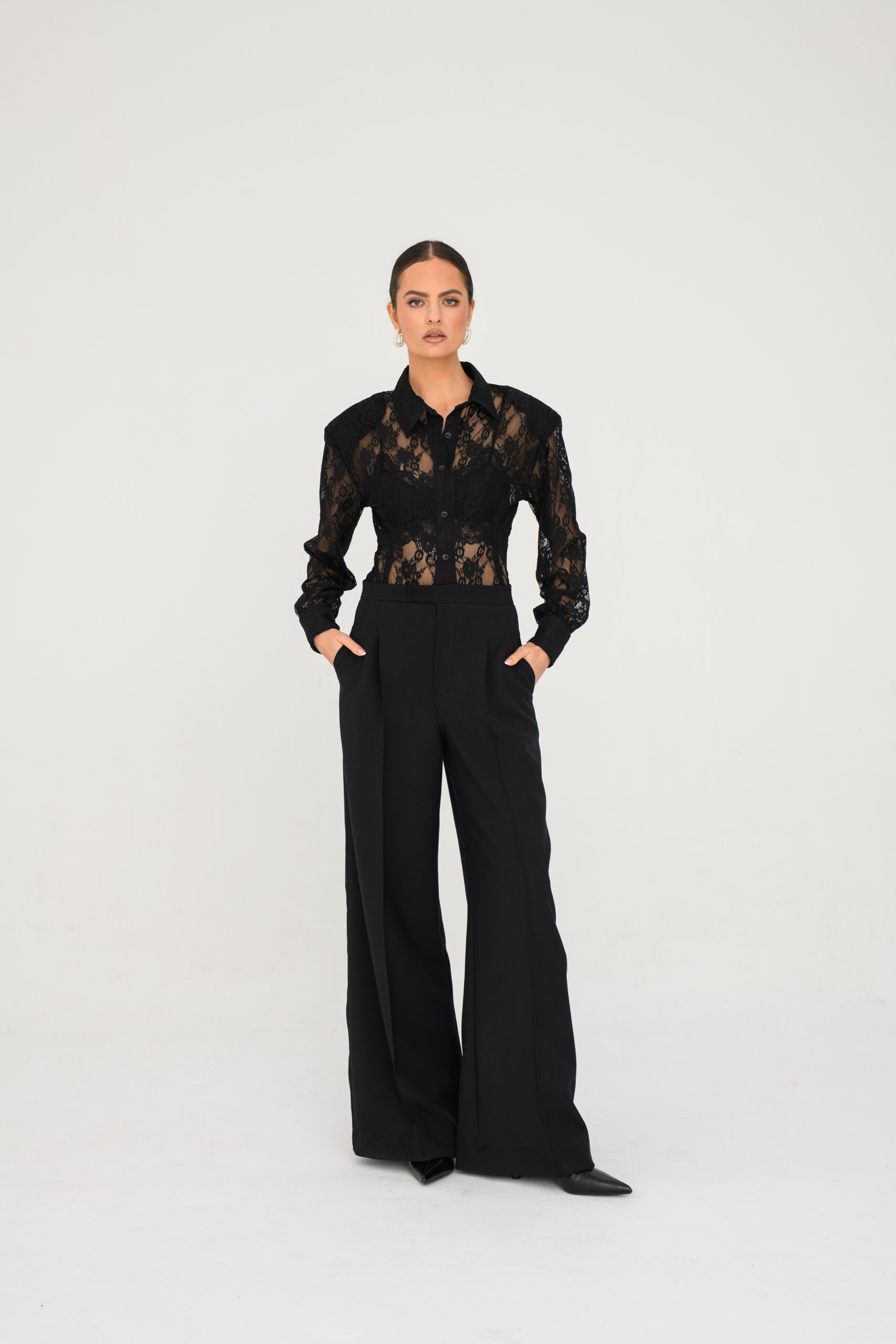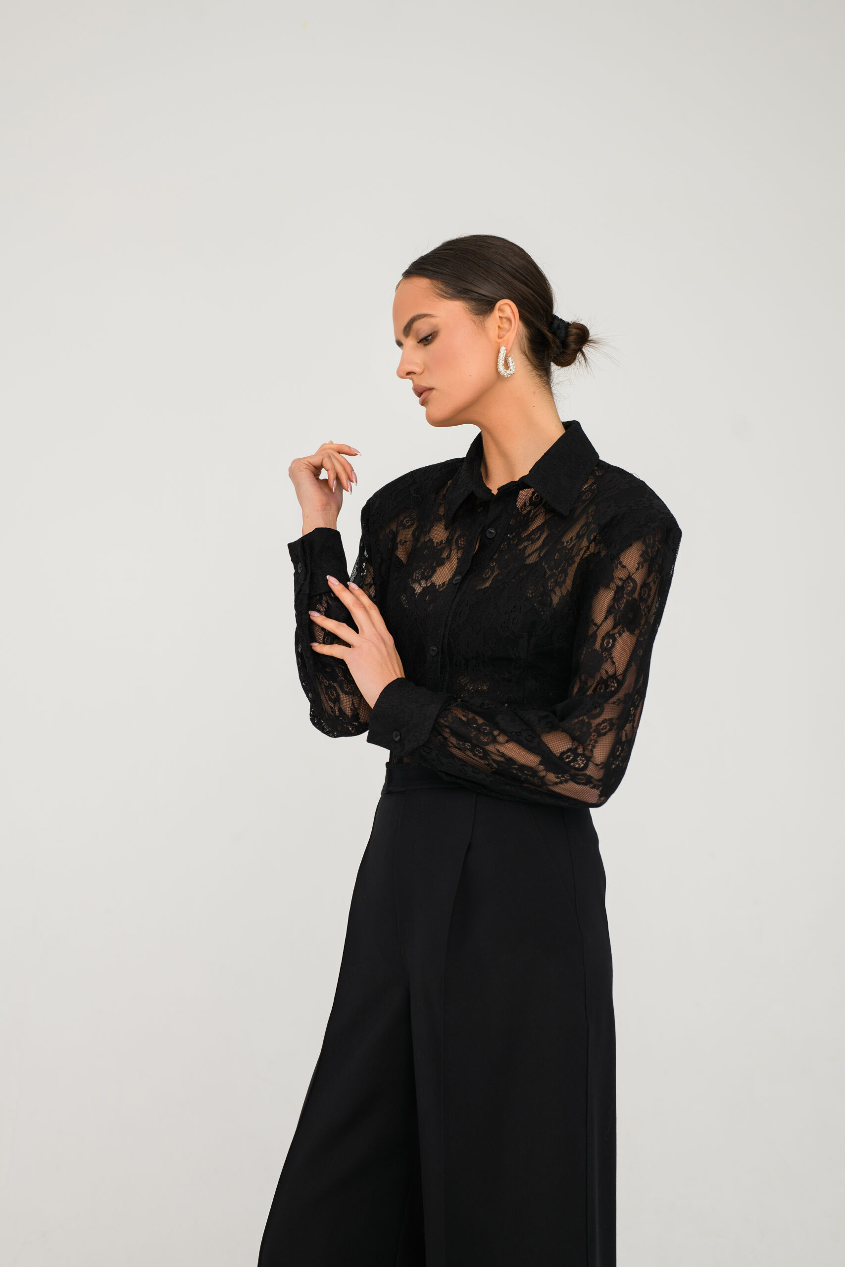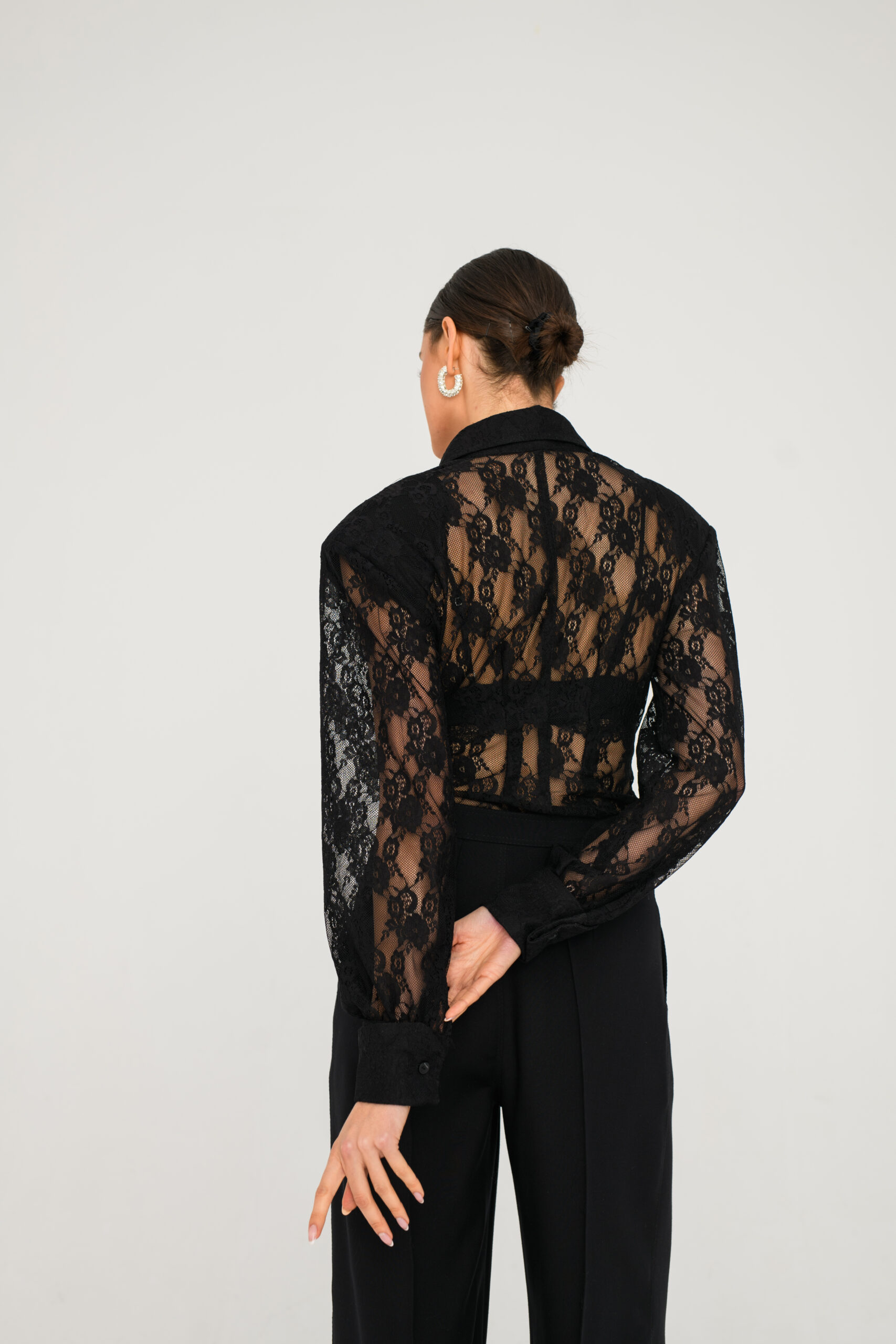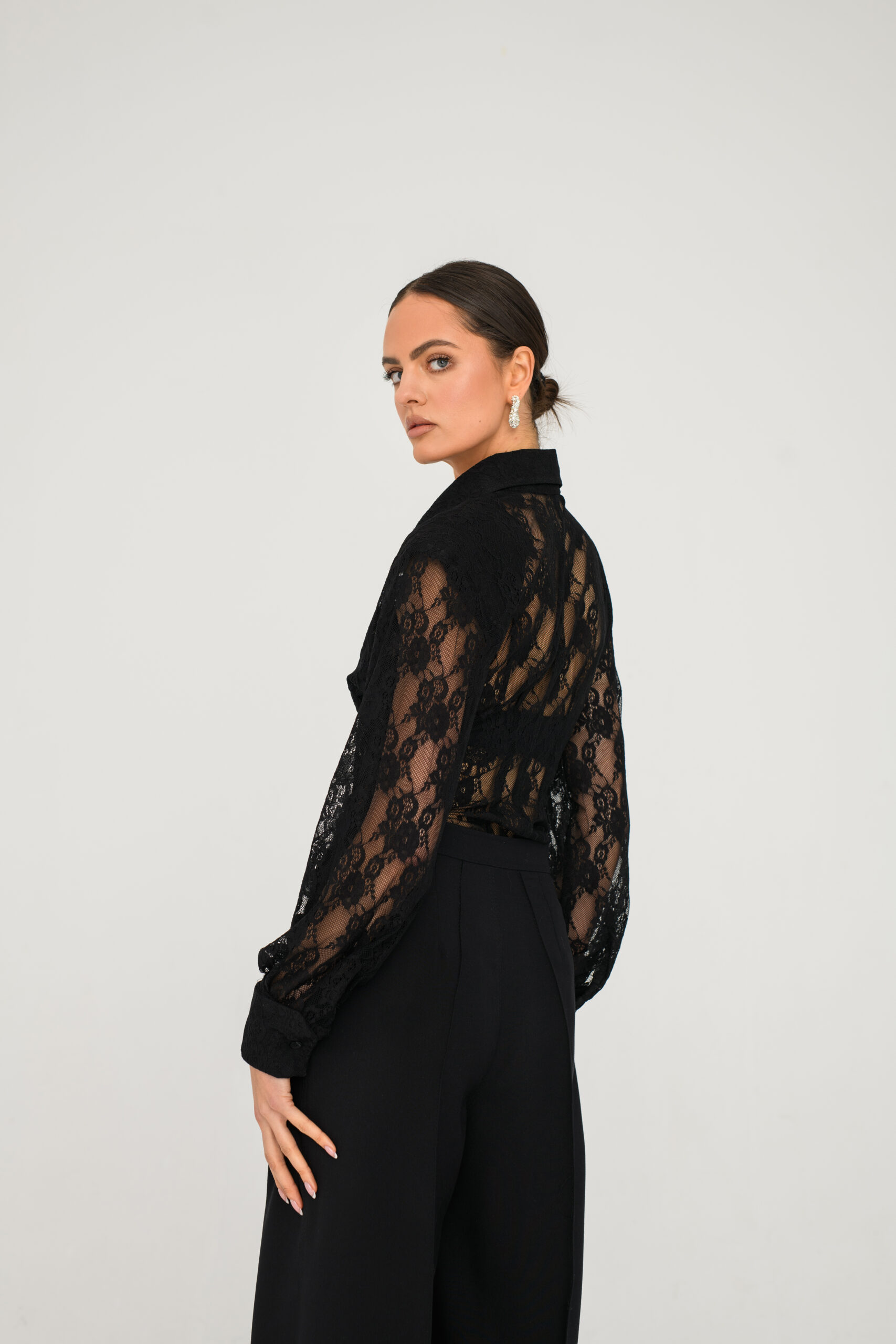 Koronkowa koszula damska z czarnej, przezroczystej koronki. Model został uzupełniony o kokardę, którą możesz wiązać według uznania. Świetnie wygląda w zestawie ze spódnicą Sevi lub z klasycznymi spodniami, a jej elegancki wygląd sprawia, że idealnie nadaje się na Wigilię, Sylwestra i inne uroczyste wyjścia.
