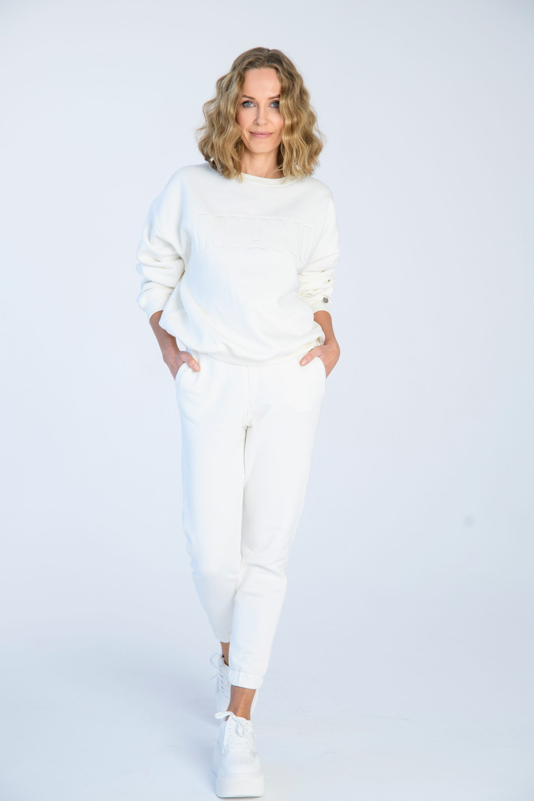 Wygodna bluza o lekko oversizowym kroju w wiosennym, jasnym kremowym odcieniu. Duże haftowane logo w tym samym kolorze ozdabia przód. Miękki ocieplany dres sprawdzi się w chłodniejsze wiosenne i letnie dni. Dodaj sportowe leginsy, dresy lub koronkowe szorty i stwórz swoją ulubioną stylizację!