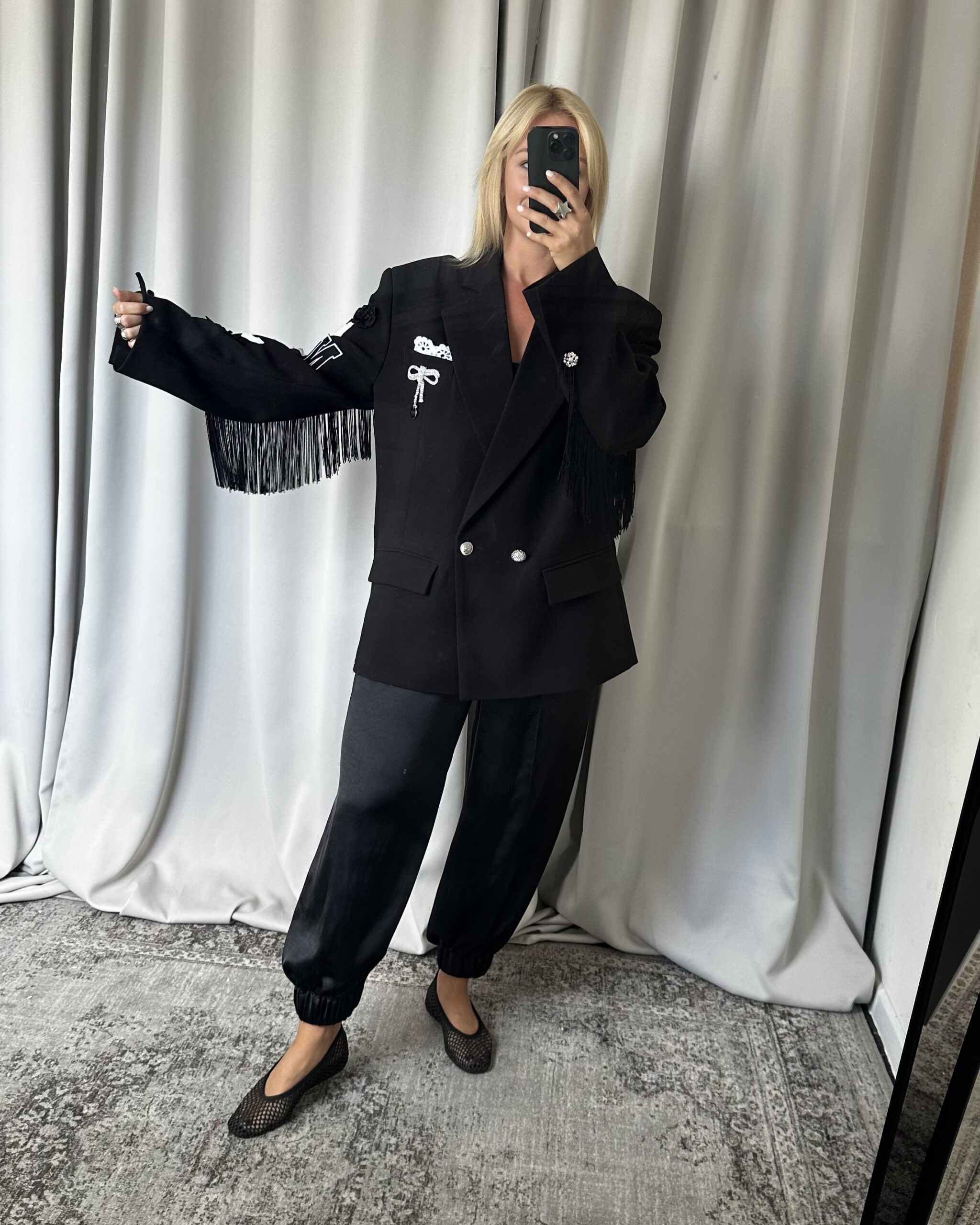 Limitowana czarna marynarka z biało-czarnymi naszywkami. Rękawy przyciągają wzrok dzięki unikalnym naszywkom Niumi wykorzystywanym w projektach z różnych sezonów, tym razem w spokojniejszej, biało-czarnej kolorystyce. Marynarka ma ozdobne guziki, po jednym na każdym rękawie, oraz klasyczne zapięcie na dwa guziki z przodu. Dodatkowego pazura dodaje pas z frędzli przyszyty wzdłuż rękawów i pleców, który subtelnie porusza się przy ruchu. To limitowany model, który sprawdzi się zarówno w eleganckich, jak i casualowych stylizacjach.