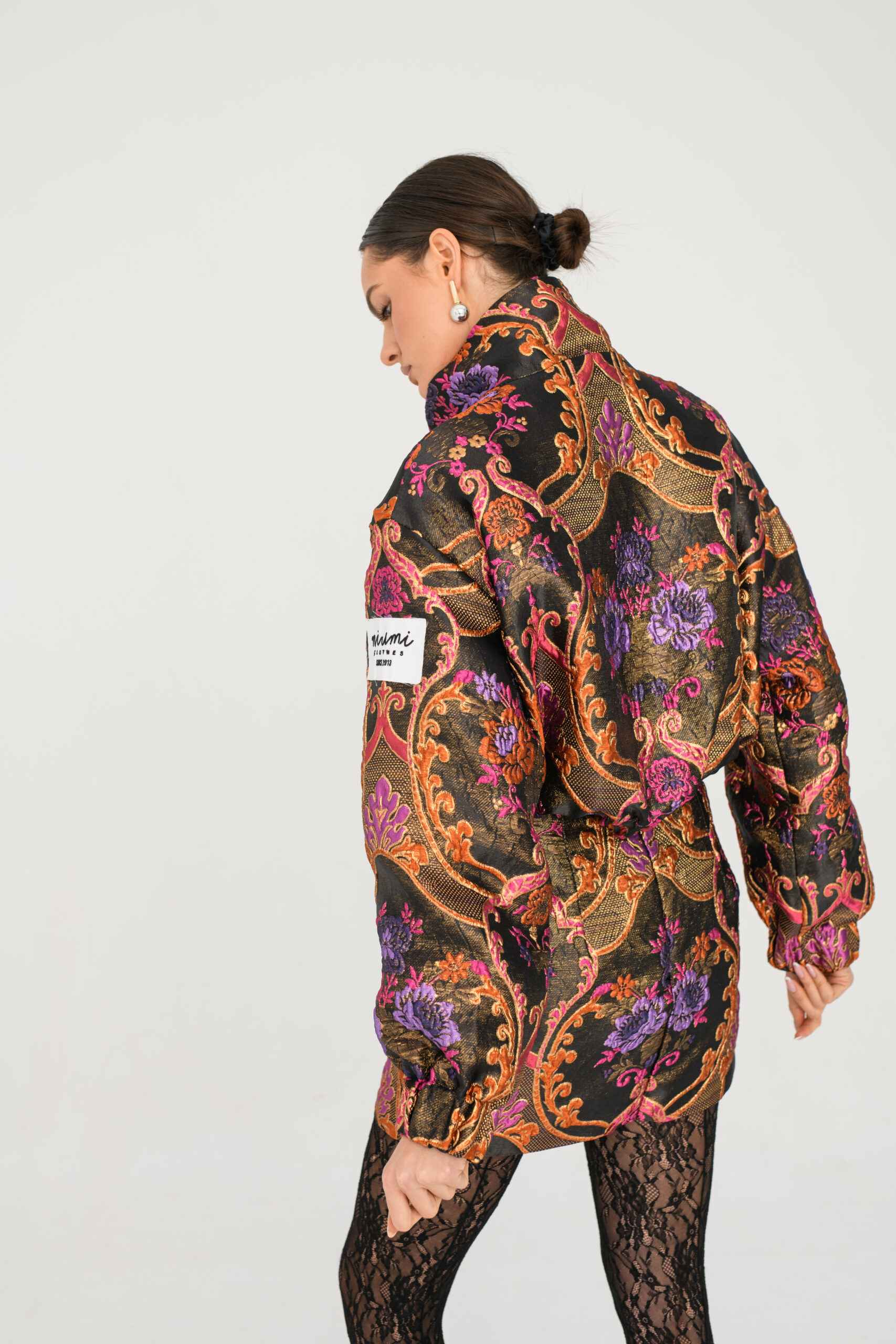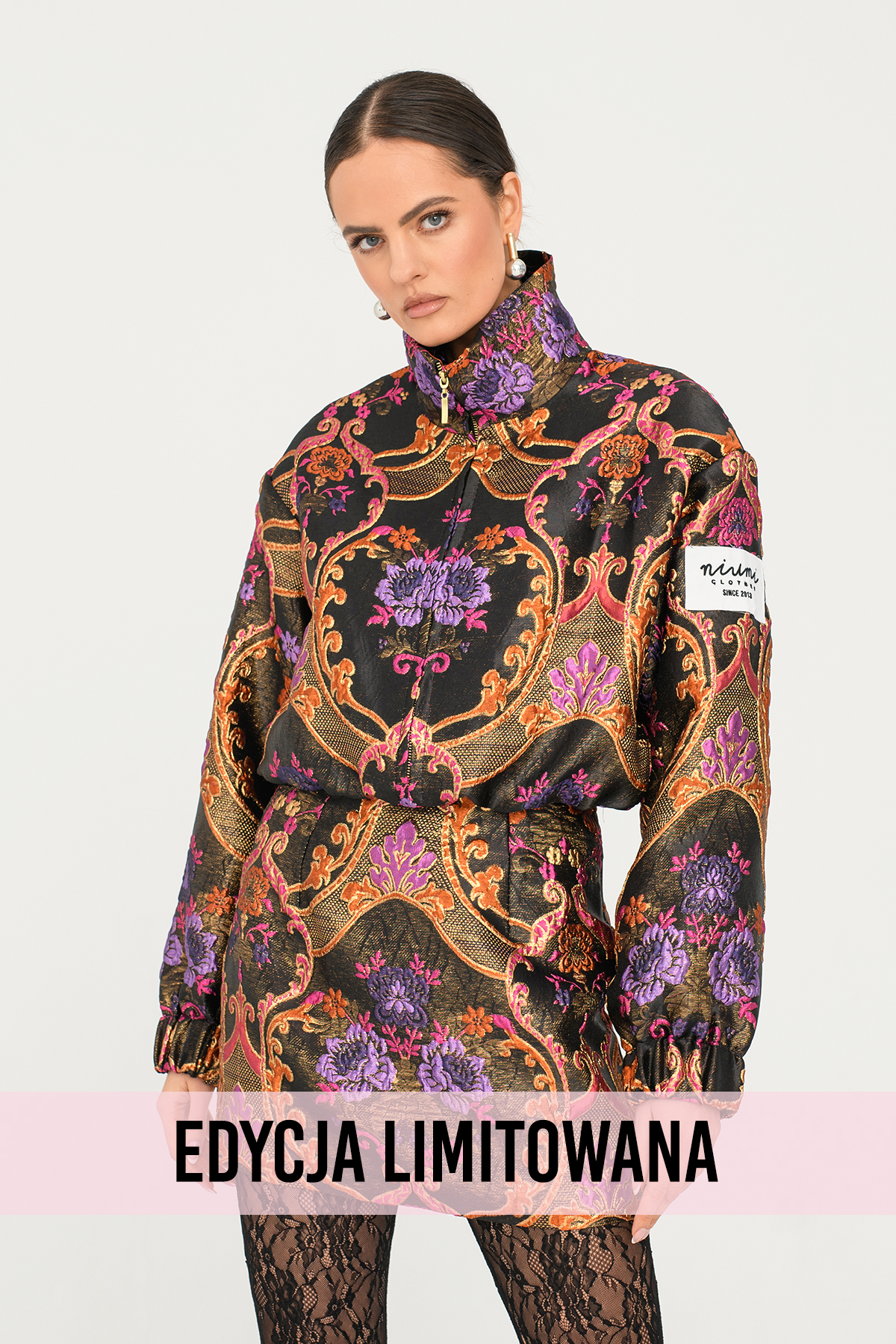 Limitowana bomberka w kwiatowo-ornamentowy wzór to lekka, cienka kurtka, która przyciąga wzrok i wyróżnia się swoim designem. Tkanina z delikatnym połyskiem dzięki włóknom metalicznym dodatkowo podkreśla jej efektowny wygląd. Model dostępny w ograniczonej ilości.