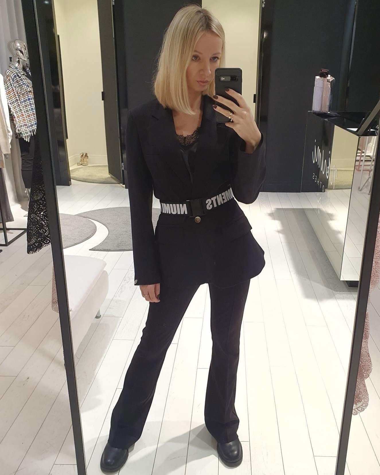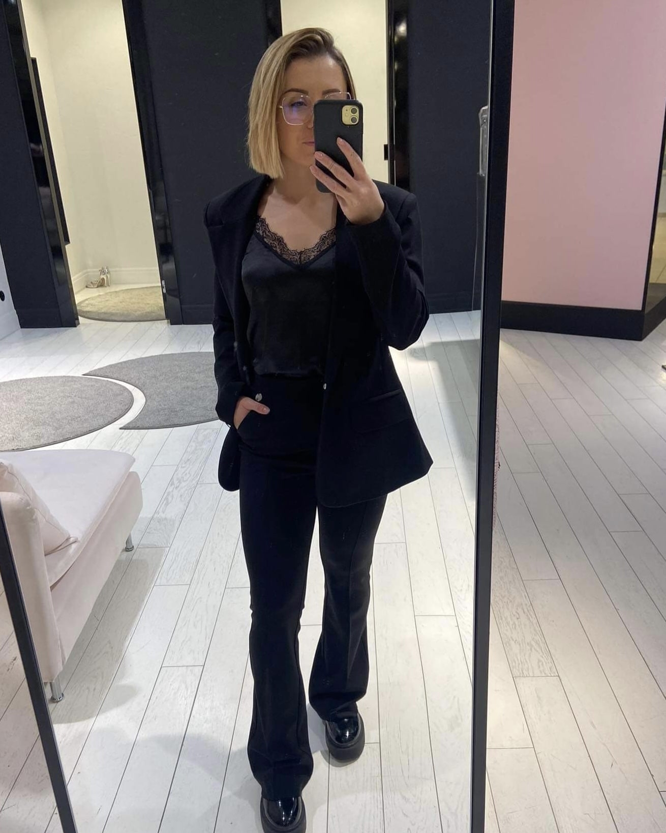 Czarna oversizowa marynarka zapinana na jedną srebrną napę. Wnętrze ozdobione logowaną podszewką i lamówką z kontrastowymi białymi napisami. Noś ją w połączeniu z prostymi czarnymi spodniami, kamizelką Missy i stwórz kobiecy garnitur.
