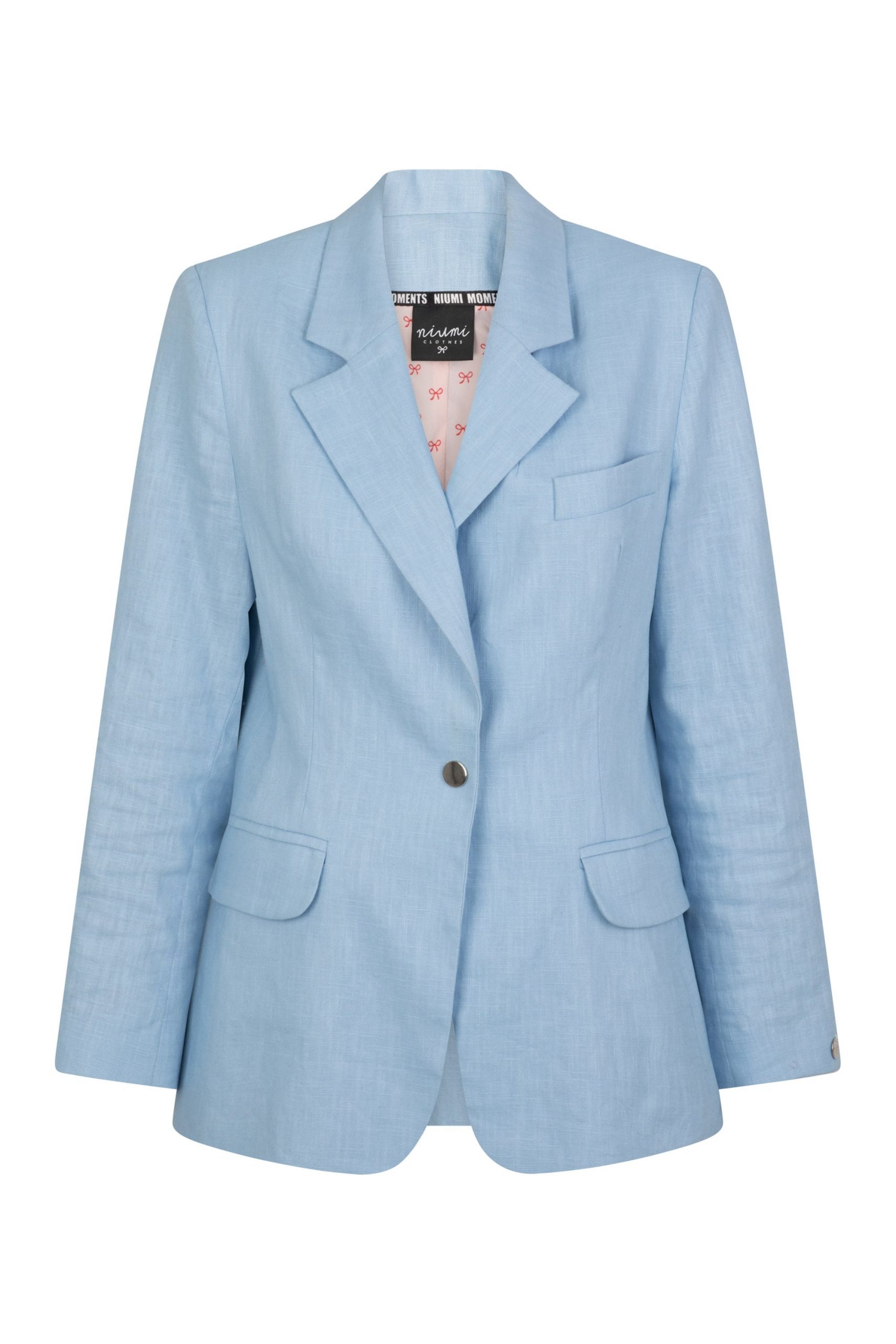 Naturalny materiał, delikatny kolor baby blue i luźniejsza forma! Marynarka idealna na wiosnę i lato. Wnętrze ozdobione podszewką w kokardki. W zestawie z szortami Birdie stworzy kobiecy garnitur. My lubimy łączyć ją również z jeansami i białym prostym topem!