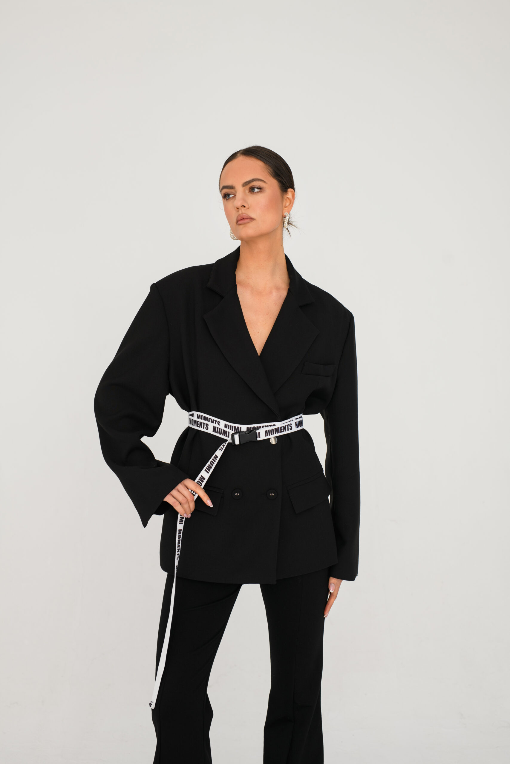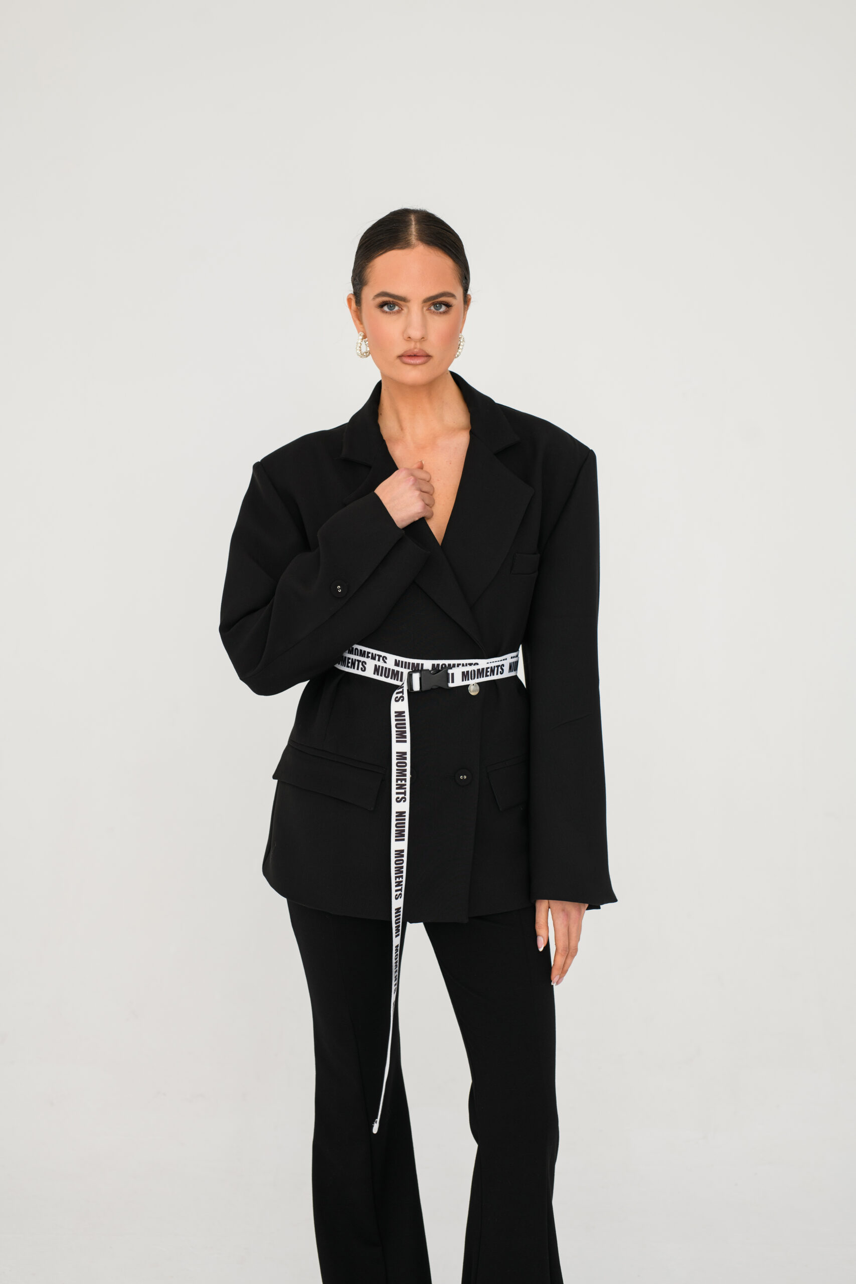 Pasek czarno-biały damski. Długi pasek wykonany z logowanej gumy Niumi Moments. Zapięcie w formie czarnej klamry umożliwia regulacje. W zależności od stylizacji można skracać i wydłużać końcówkę paska oraz przewiązywać go 2 lub 3 razy. Sprawdzi się zarówno jako dodatek do jeansów lub szortów ale także jako element podkreślający talię w połączeniu z marynarką.