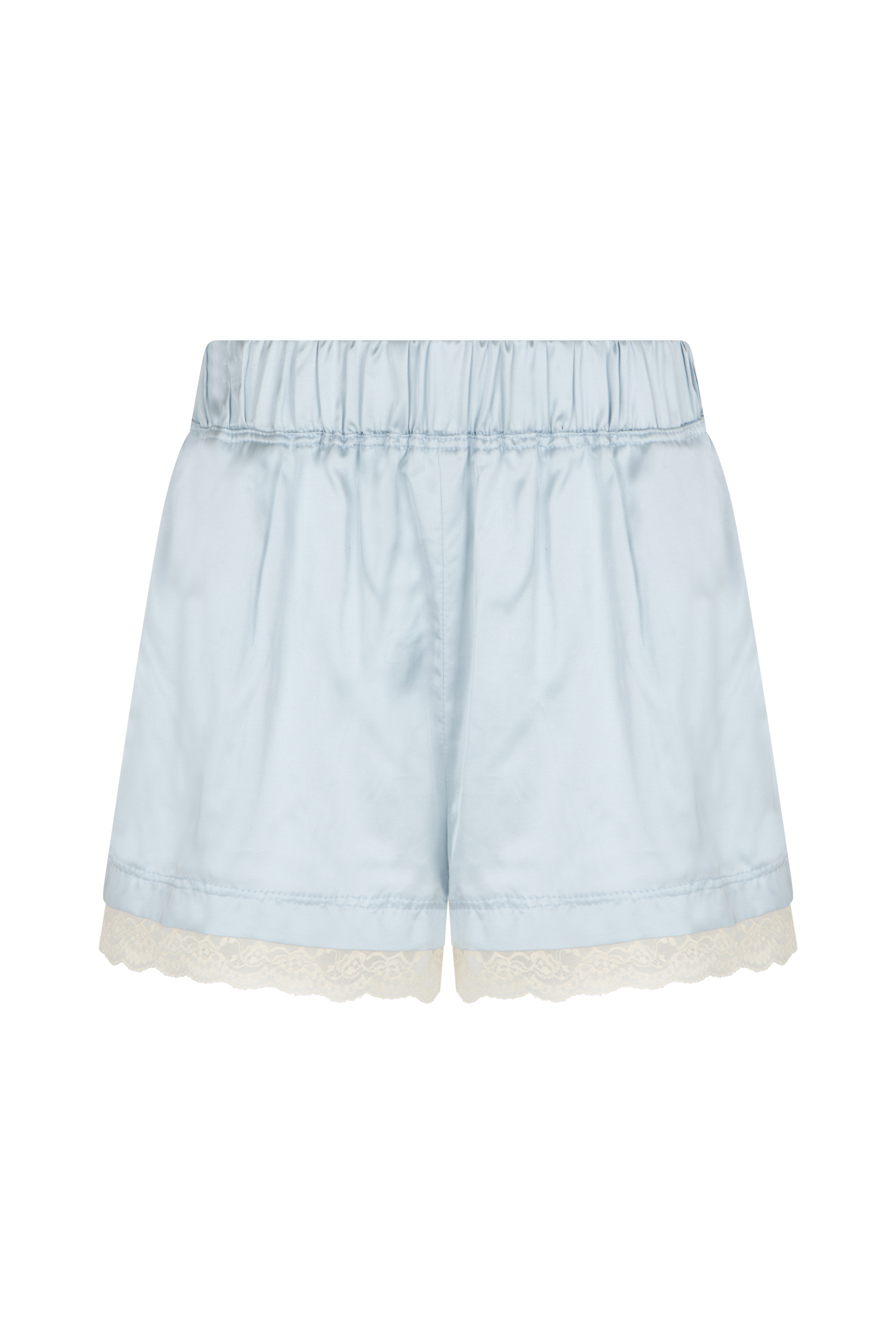 Satynowe szorty z koronką w niebieskim odcieniu, uszyte głównie z wiskozy, idealne na co dzień do wiosennych stylizacji. Do kompletu dostępna jest też koszula i top.