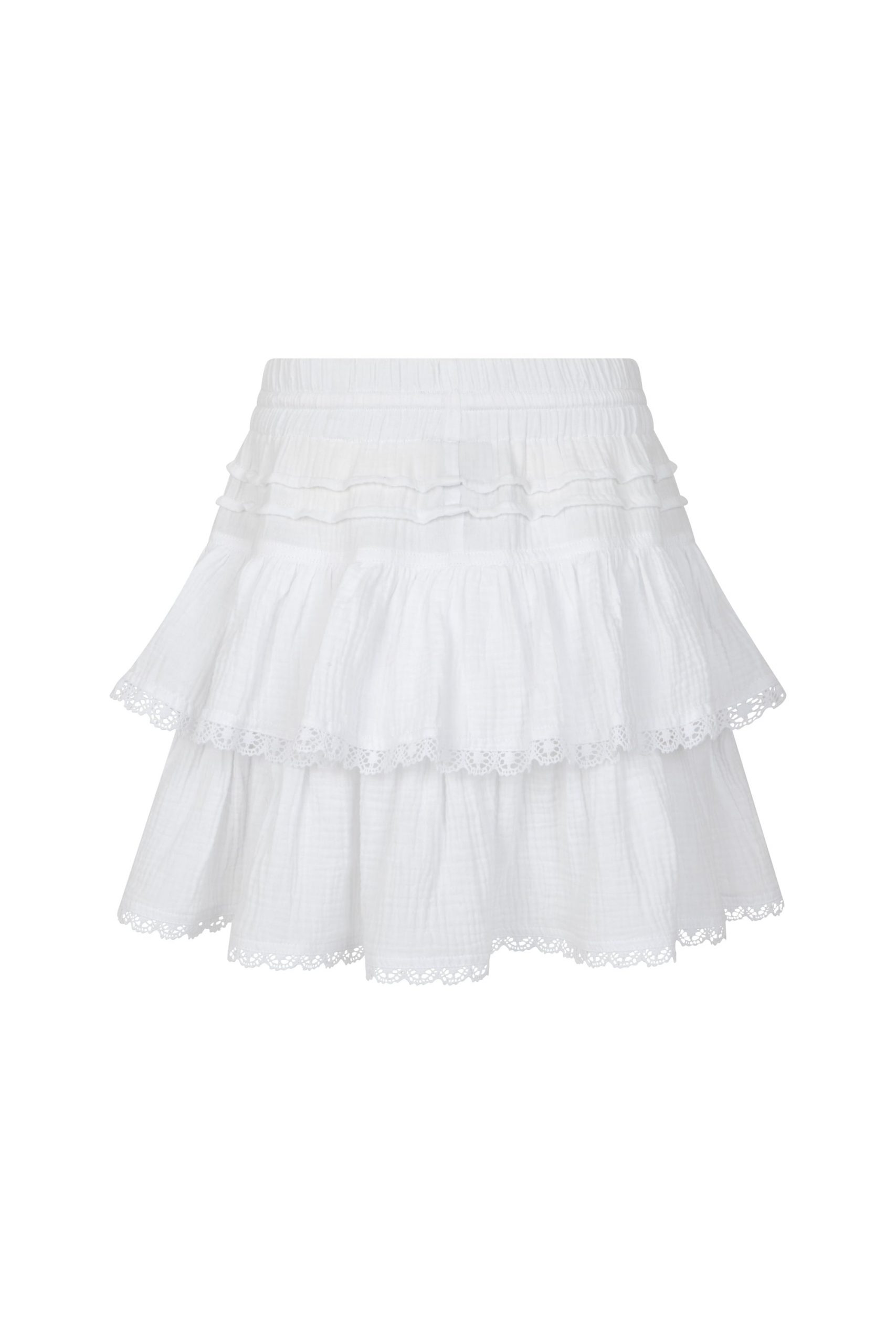 Biała zwiewna spódniczka z falbanami. Wykonana w całości z naturalnego materiału. Wygodna gumka w talii oraz ozdobne sznureczki. Falbany wykończone białą delikatną koronką. Razem z bluzką Merida stworzą idealny letni biały total look, który możesz nosić podczas upalnych wakacji, w miejskim wydaniu z wygodnymi butami lub wieczorami w połączeniu z ulubionymi szpilkami.