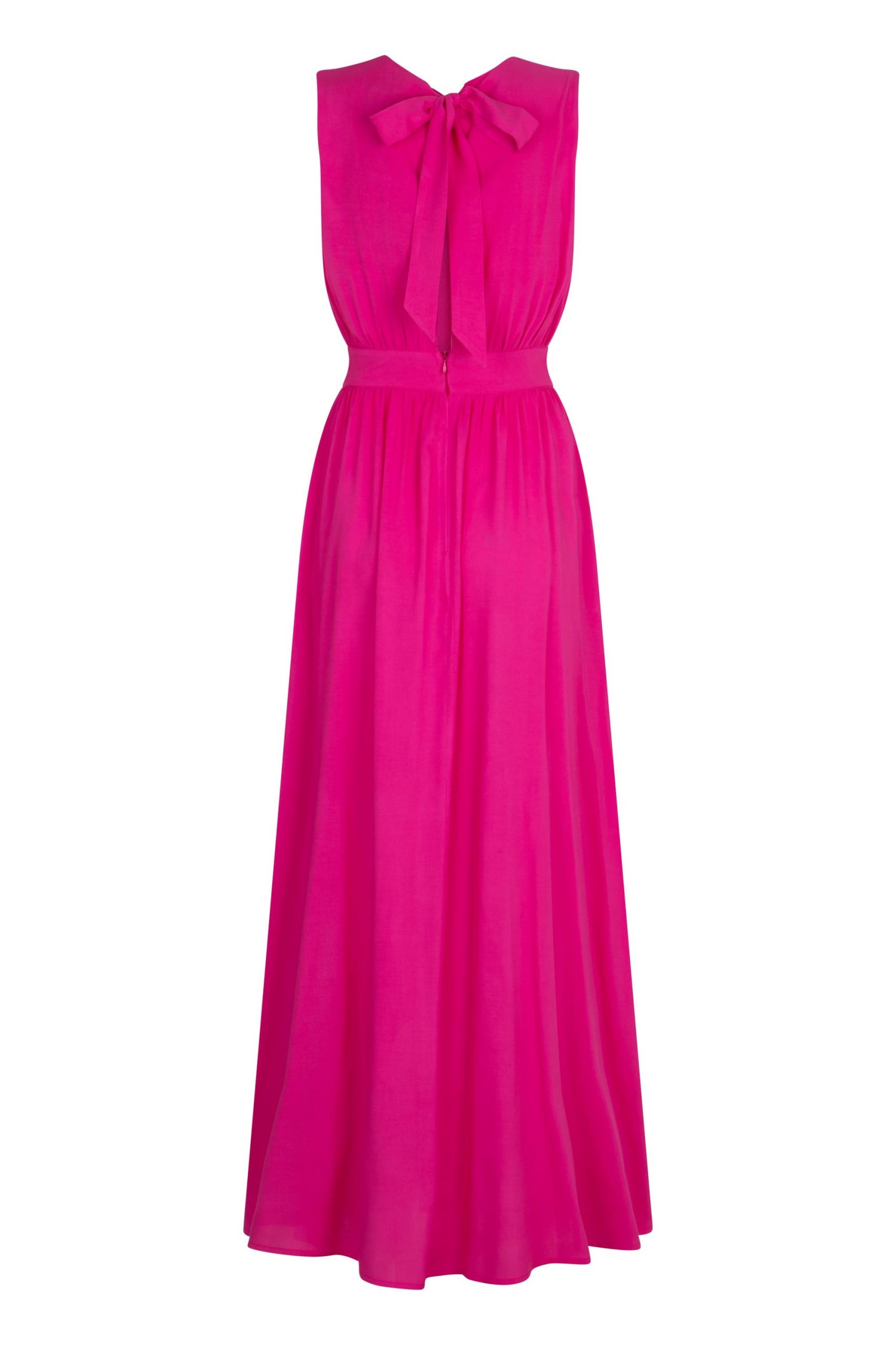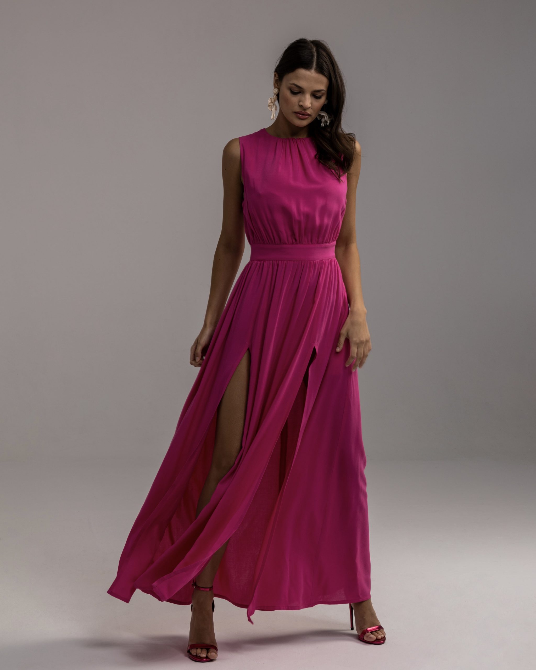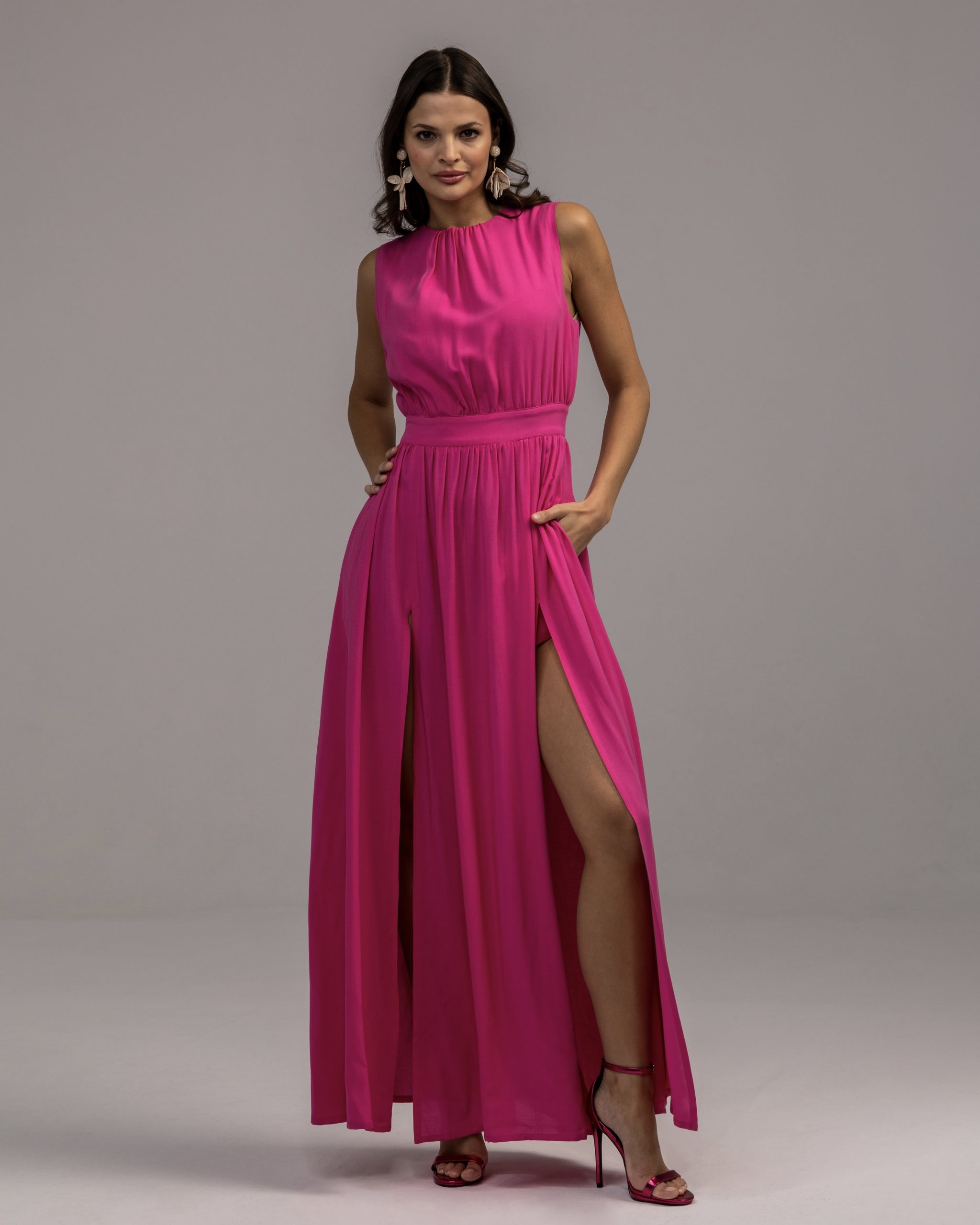 Długa zwiewna sukienka w kolorze mocnej fuksji. Dwa wysokie rozcięcia pięknie eksponują nogi. Nieoczywisty dekolt, w kontraście do dołu został zabudowany pod samą szyję. Tył natomiast eksponuje plecy dzięki rozcięciu zakończonym kokardą. Podkreślona talia nadaje sylwetce kobiecych proporcji. Nasza klasyczna, kobieca propozycja będzie idealną sukienką na specjalne okazje. Dobierz ulubione dodatki i zachwycaj podczas Twoich wyjątkowych momentów!