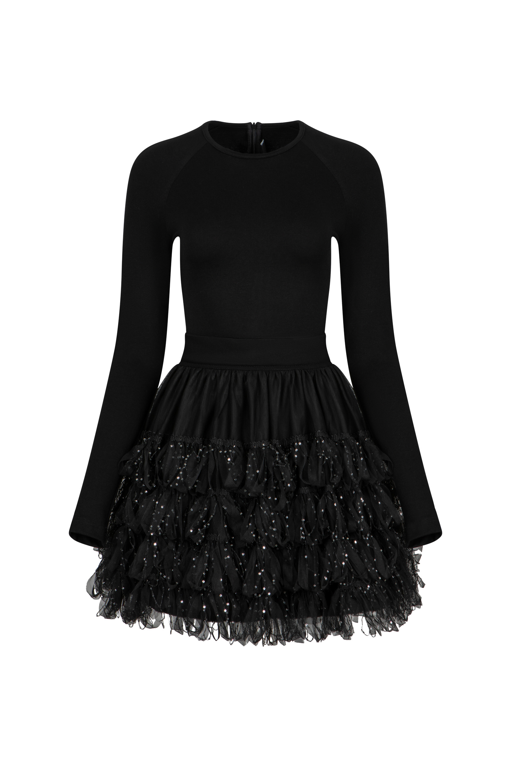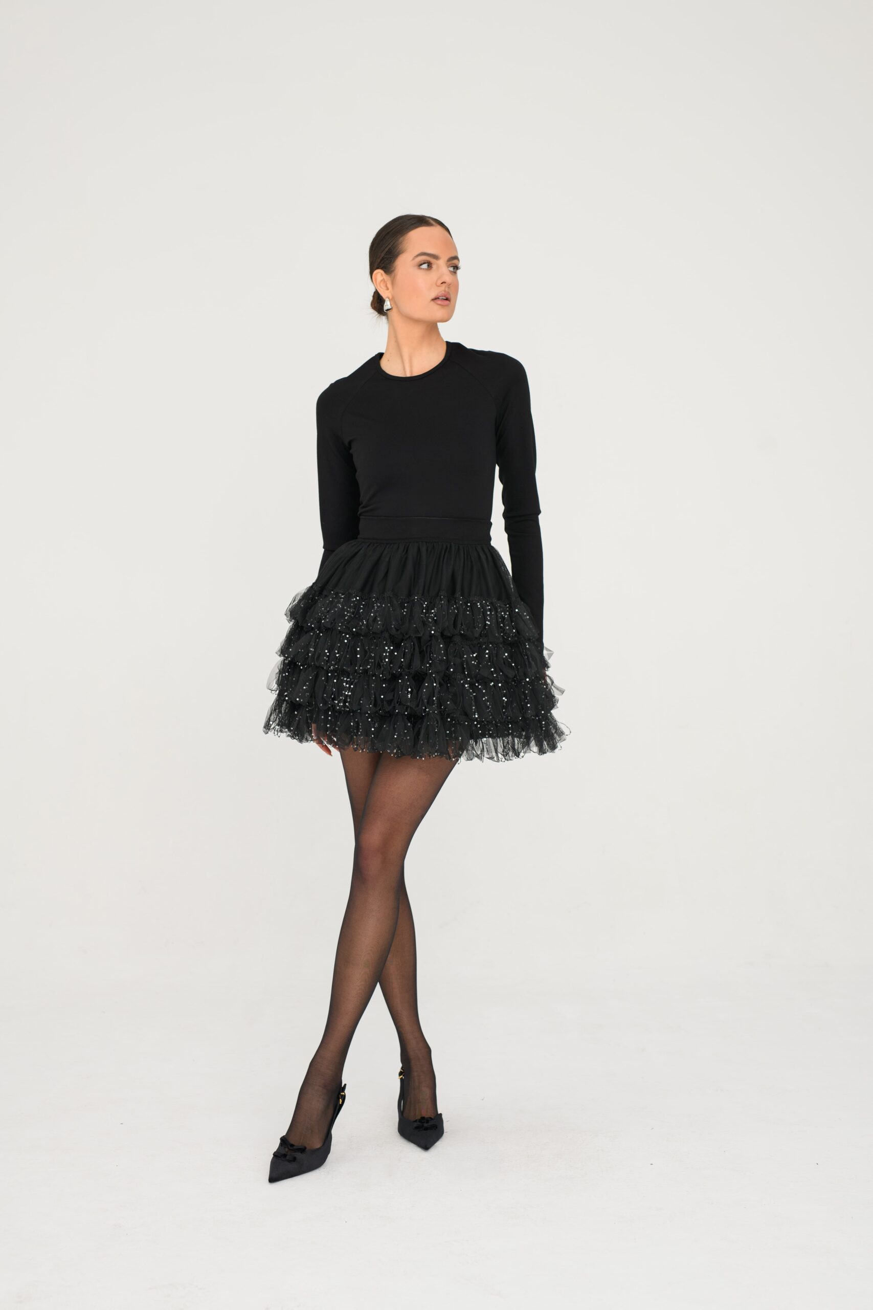 Sukienka bombka czarna uszyta jest z przewiewnej wiskozy, a jej tiulowy dół ozdobiono srebrnymi cekinami. Model prezentuje się wyjątkowo efektownie i przyciąga spojrzenia. To idealny wybór na Wigilię, Sylwestra oraz inne wyjątkowe okazje.