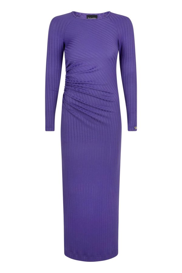 Długa dopasowana sukienka w fioletowym kolorze. Wykonana z przyjemnego lekko elastycznego materiału w prążek. Asymetryczne marszczenie na wysokości talii podkreśla figurę. Dodaj do niej ulubione szpilki lub sportowe buty, długi płaszcz lub puchową kurtkę i stwórz swoją ulubioną stylizację!