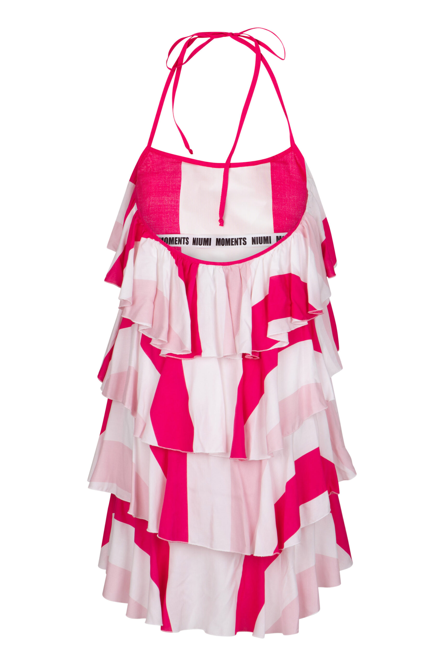 Krótka, zwiewna sukienka z falbankami w różowo-białe paski z gumą na plecach. Damska sukienka świetnie sprawdzi się na wakacyjny wyjazd i relaks nad basenem! Sukienka z wiązaniem na szyi wykonana jest z idealnej na lato wiskozy. Połącz wiskozową sukienkę z ulubionymi klapkami czy sandałami i stwórz swoją letnią, wygodną stylizację!