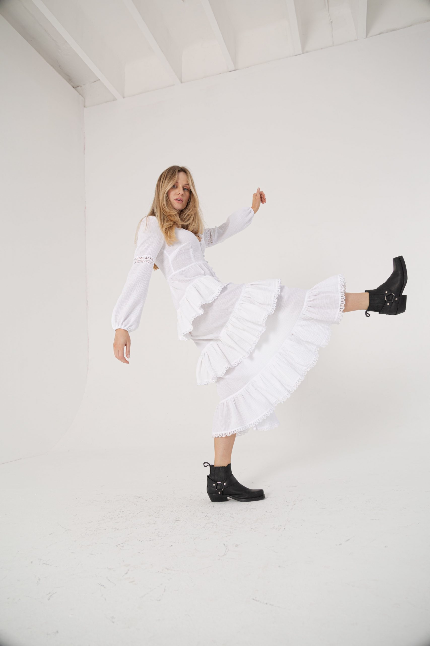 Biała, długa sukienka z falbanami w stylu boho. Wykończona delikatną białą koronką. Dekolt w kształcie litery V został ozdobiony białymi guziczkami a długie lekko bufiaste rękawy dodają całości romantycznego charakteru. Rozepnij ją na dowolnej długości i wyeksponuj nogi! My lubimy łączyć ją w nieoczywisty sposób z ciemnymi kowbojkami. Dodaj ulubione wakacyjne dodatki i noś ją na plażę i podczas lata w mieście.