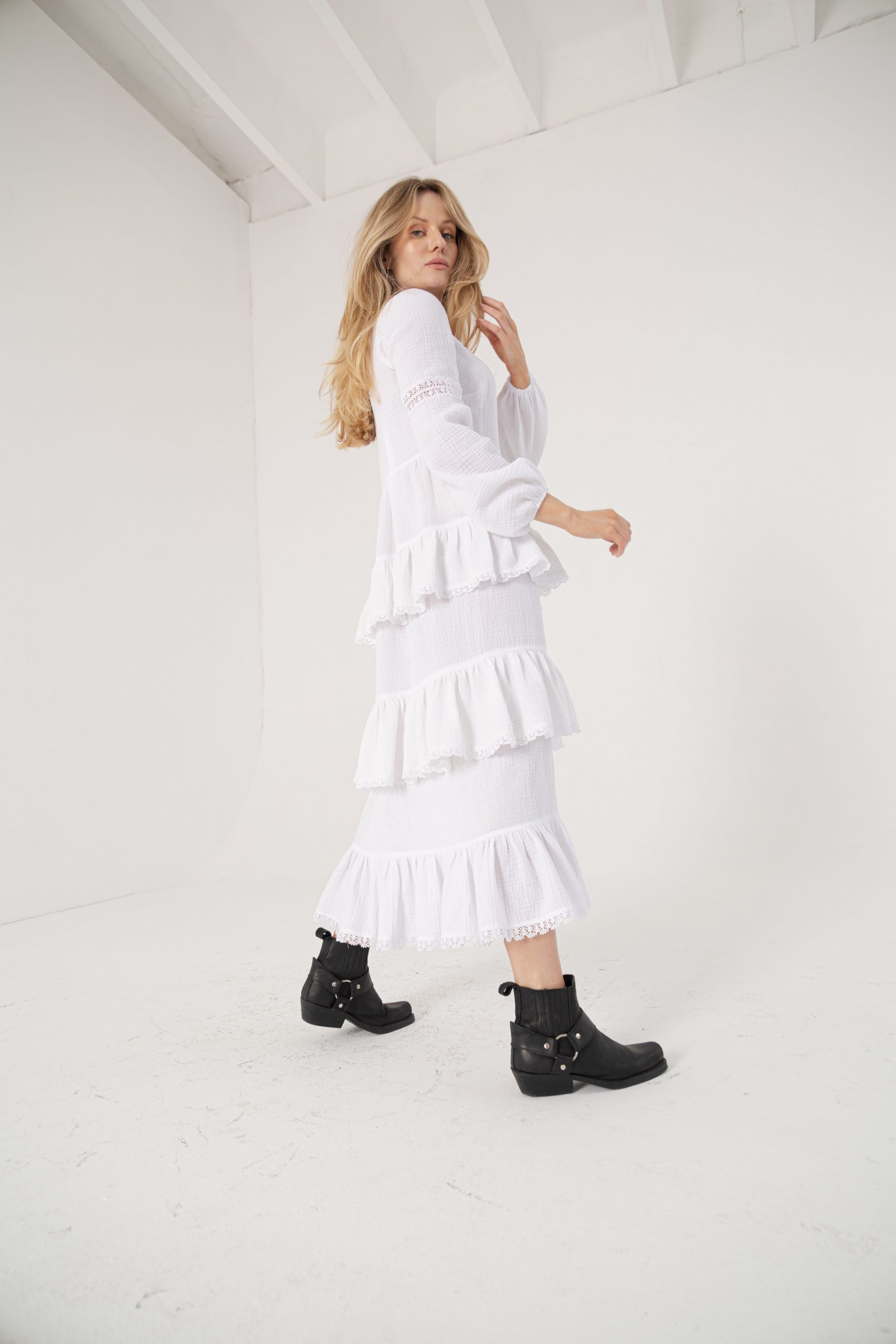 Długa, biała, bawełniana, letnia sukienka z falbanami Moana