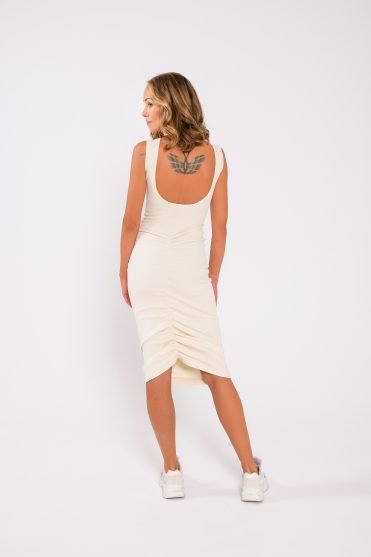 Kremowa bawełniana sukienka doskonała na różne okazję, sukienka prezentuje wyjątkowy dekolt na plecach, dodając subtelny element zmysłowości. Wykonana z wysokiej jakości bawełny, gwarantuje komfort noszenia i doskonałe dopasowanie.