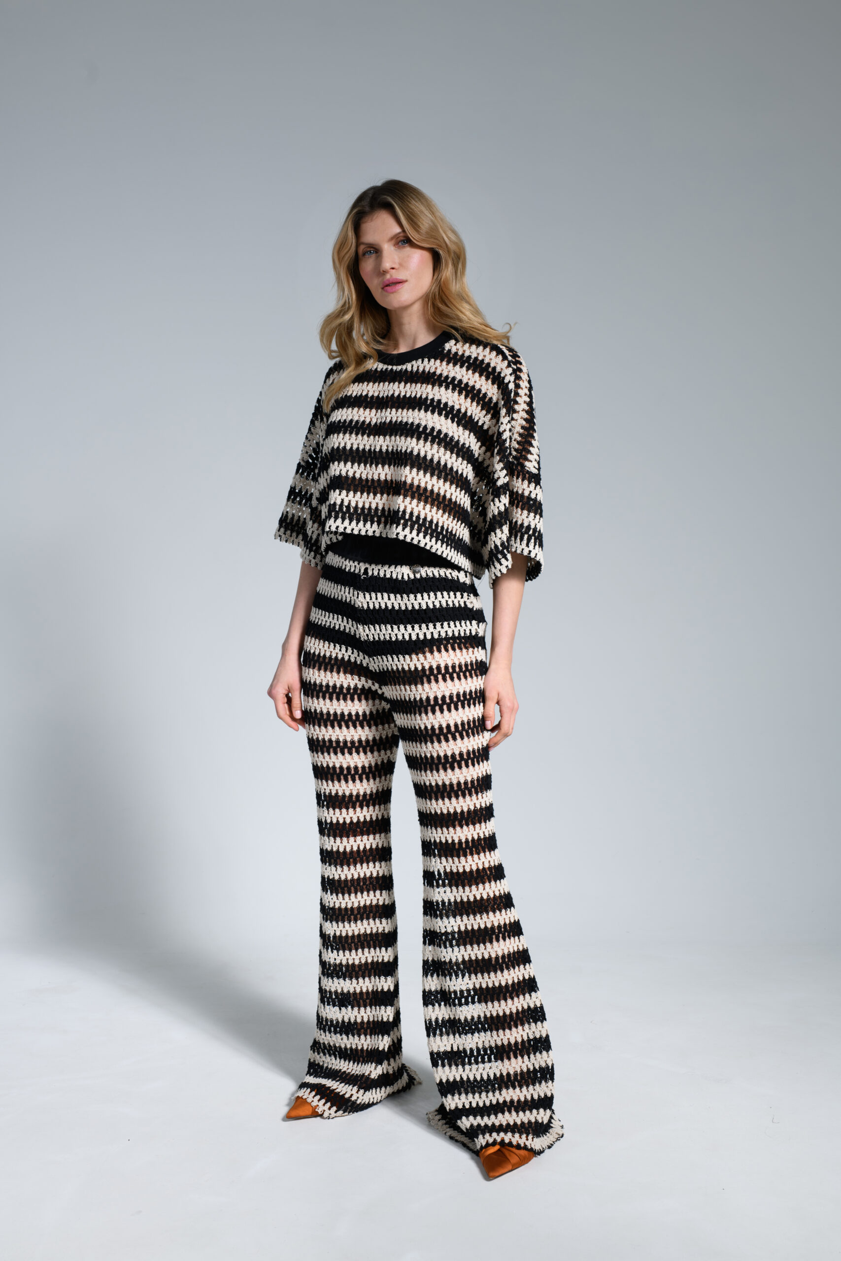 Szerokie spodnie damskie w paski wykonane są z przewiewnej, lekkiej tkaniny imitującej szydełkowy splot. Połączenie czerni z naturalnym beżem tworzy wyjątkowy, letni wzór w paski, który świetnie wpisuje się w modne stylizacje Niumi. Spodnie mają luźny, rozkloszowany krój i elastyczną gumę w pasie, dzięki czemu dobrze dopasowują się do sylwetki. To idealny model na lato – świetnie sprawdzą się zarówno na plażę np. na strój kąpielowy, jak i na co dzień – z prostym topem czy białą koszulą. Do kompletu można dobrać czarne majtki Vela z wysokim stanem, które zostały zaprojektowane specjalnie pod ten model.