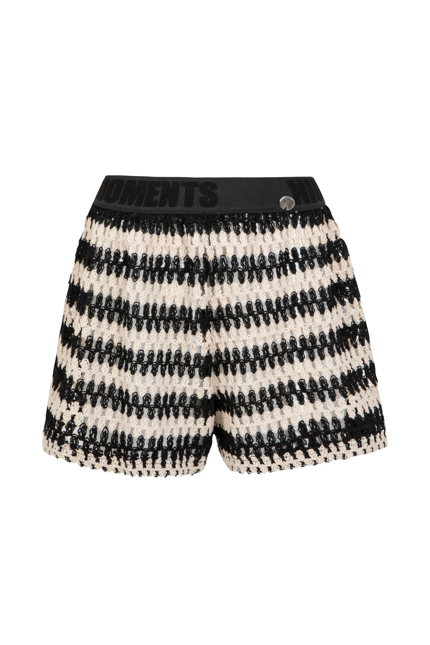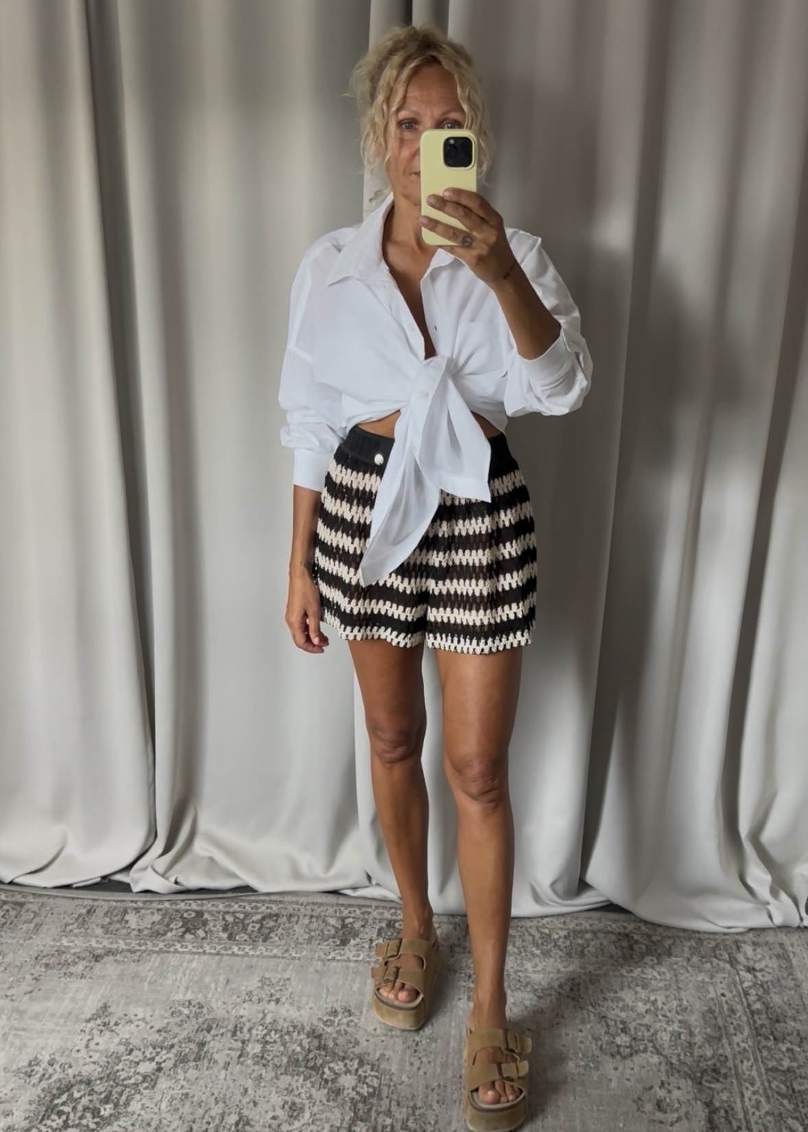 Szorty damskie w paski wykonane są z przewiewnej, lekkiej tkaniny imitującej szydełkowy splot. Połączenie czerni z naturalnym beżem tworzy efektowny, letni wzór w paski, który idealnie wpisuje się w wakacyjne stylizacje Niumi. Model ma luźny, komfortowy krój oraz elastyczną gumę w pasie z logo, co zapewnia wygodę noszenia i dobre dopasowanie do sylwetki. To doskonały wybór na lato – sprawdzi się zarówno na plaży jak i w codziennych stylizacjach. Szorty można połączyć z majtkami Vela z wysokim stanem, które zostały zaprojektowane specjalnie z myślą o tym modelu.