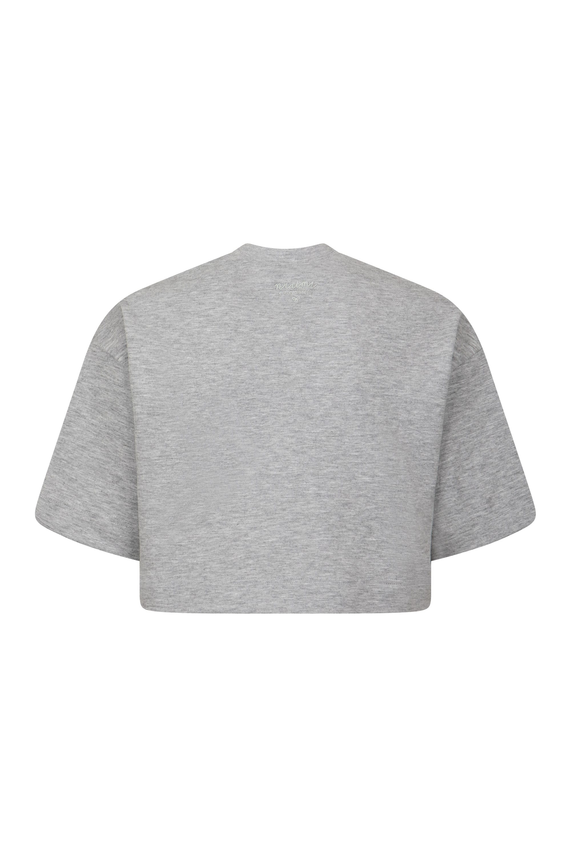 Szary krótki oversizowy Tshirt z logo. Lekko oversizowy, krótszy krój, dłuższe rękawki. Wykonany z materiału typu punto świetniej jakości, dzięki czemu możesz nosić go też jako bardziej elegancką bluzkę na przykład do garnituru. Małe haftowane logo w kolorze całości subtelnie zdobi szyję.