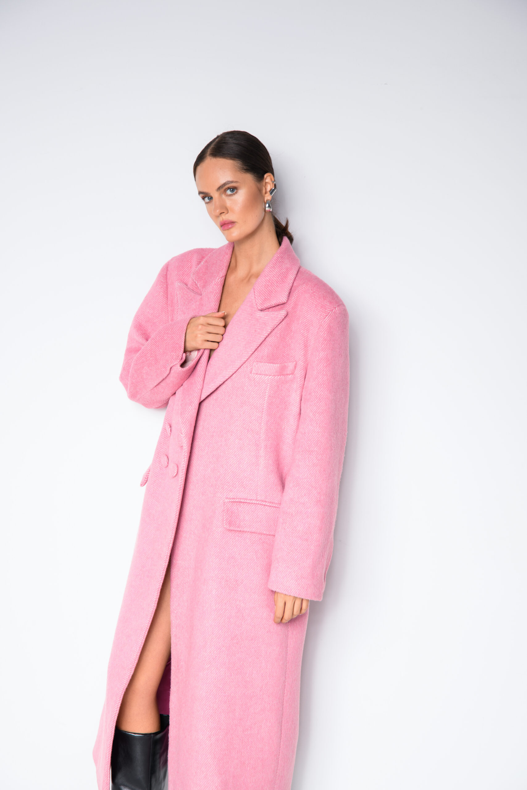 Wełniany płaszcz na jesień w subtelnej jodełce z wiskozową podszewką i logowanymi detalami. Klasyczny kołnierz z klapami, dwurzędowe zapięcie na guziki i dwie kieszenie boczne. Lekko luźny krój ładnie układa się na sylwetce. Różowy kolor dodaje świeżości i kobiecego akcentu, pasując zarówno do codziennych, jak i eleganckich stylizacji.